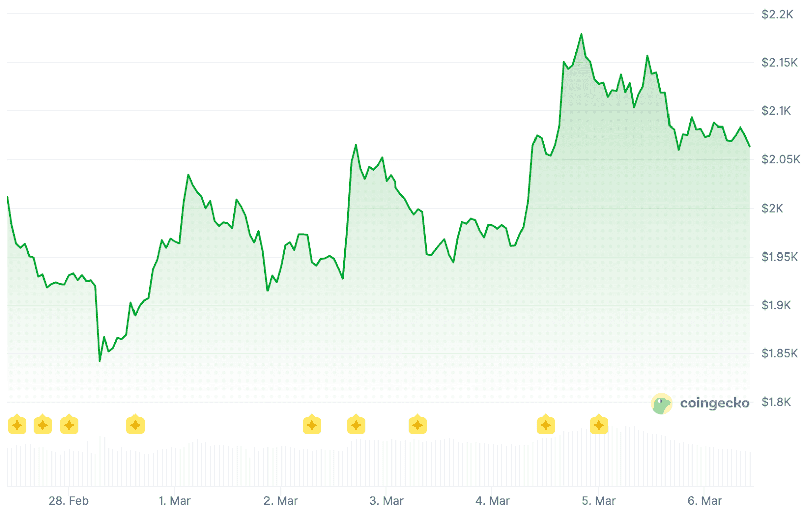 De ETH koers bereikte woensdag nog de 2.200 dollar. Dat was een welkome opleving na het dieptepunt van ongeveer 1.800 dollar eind februari. Tegelijk is het de hoogste prijs voor de digitale munt in ruim een maand.