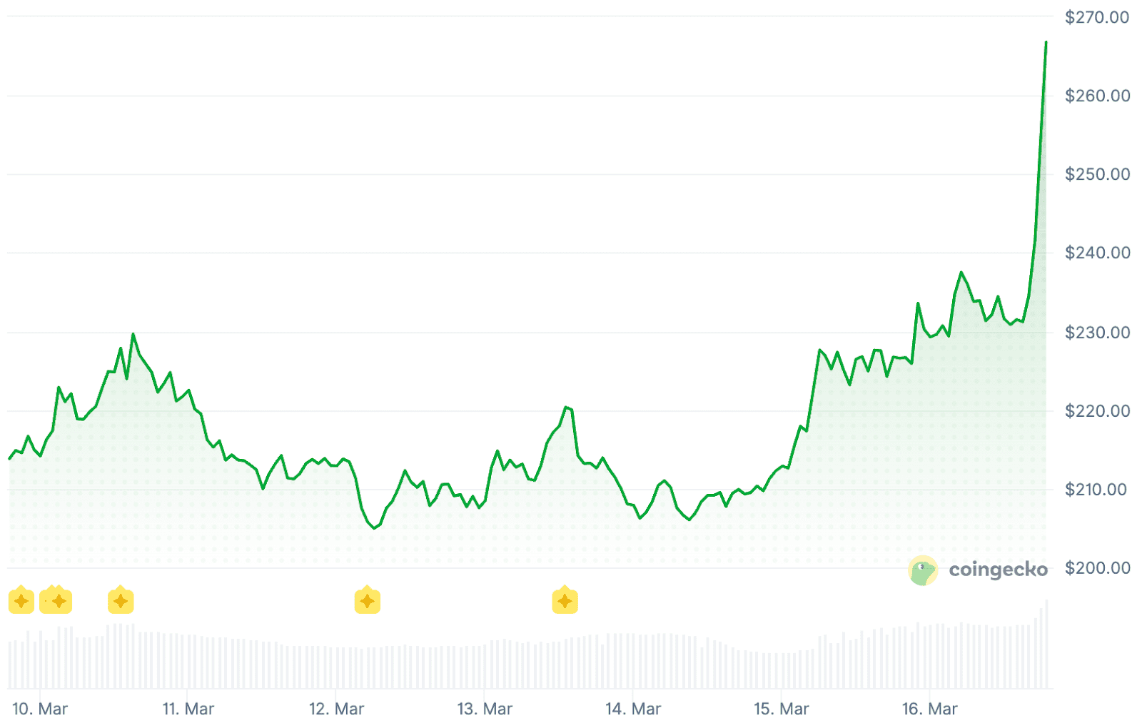 Zcash (ZEC) steeg 17,5% naar $266,80. De privacy-token was vorig jaar al een koploper toen hij in twee maanden tijd steeg van rond $30 naar een piek van ongeveer $700. Nu de cryptomarkt weer aantrekt, lijkt ook de interesse in privacy-tokens terug te keren.