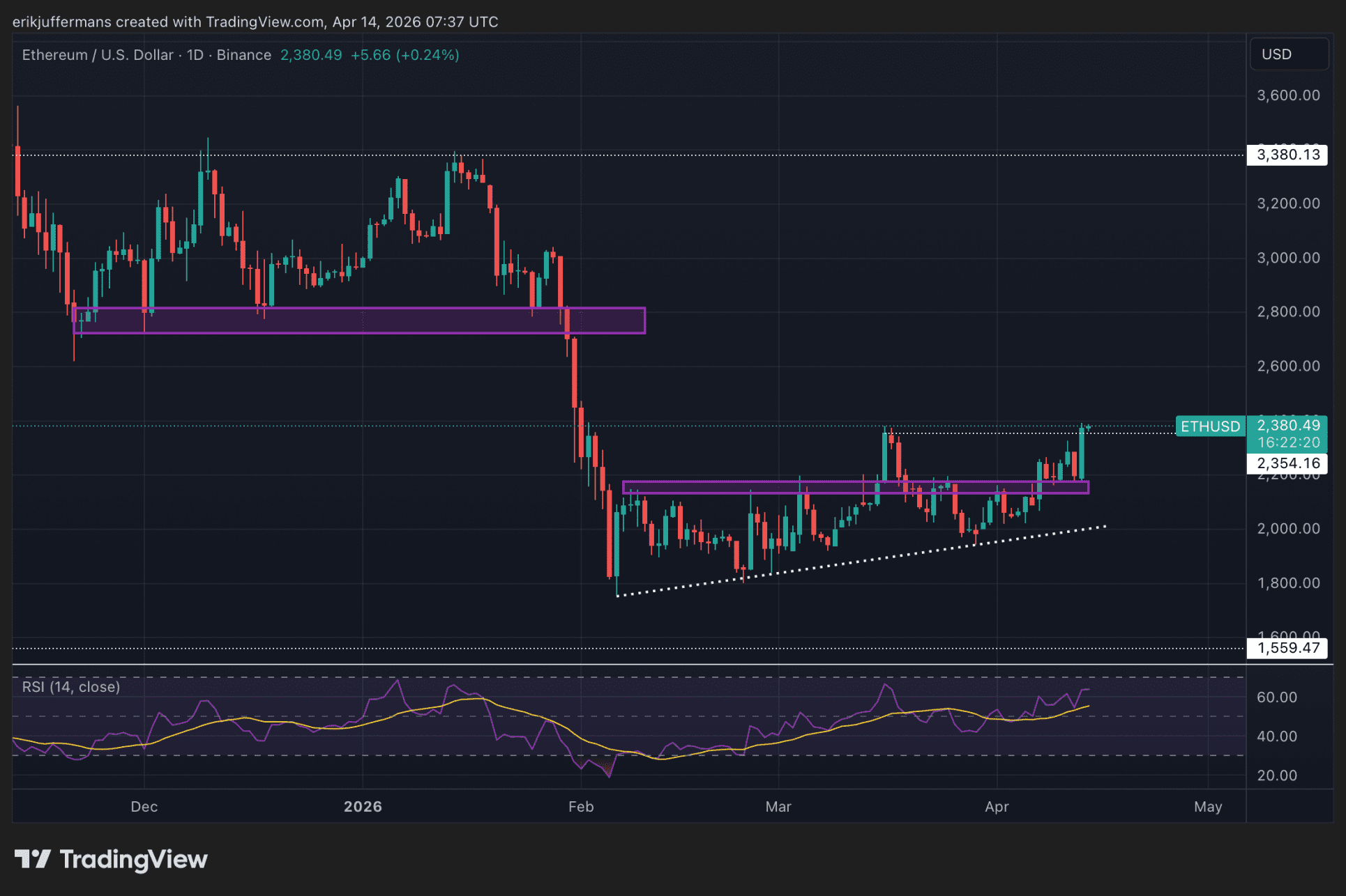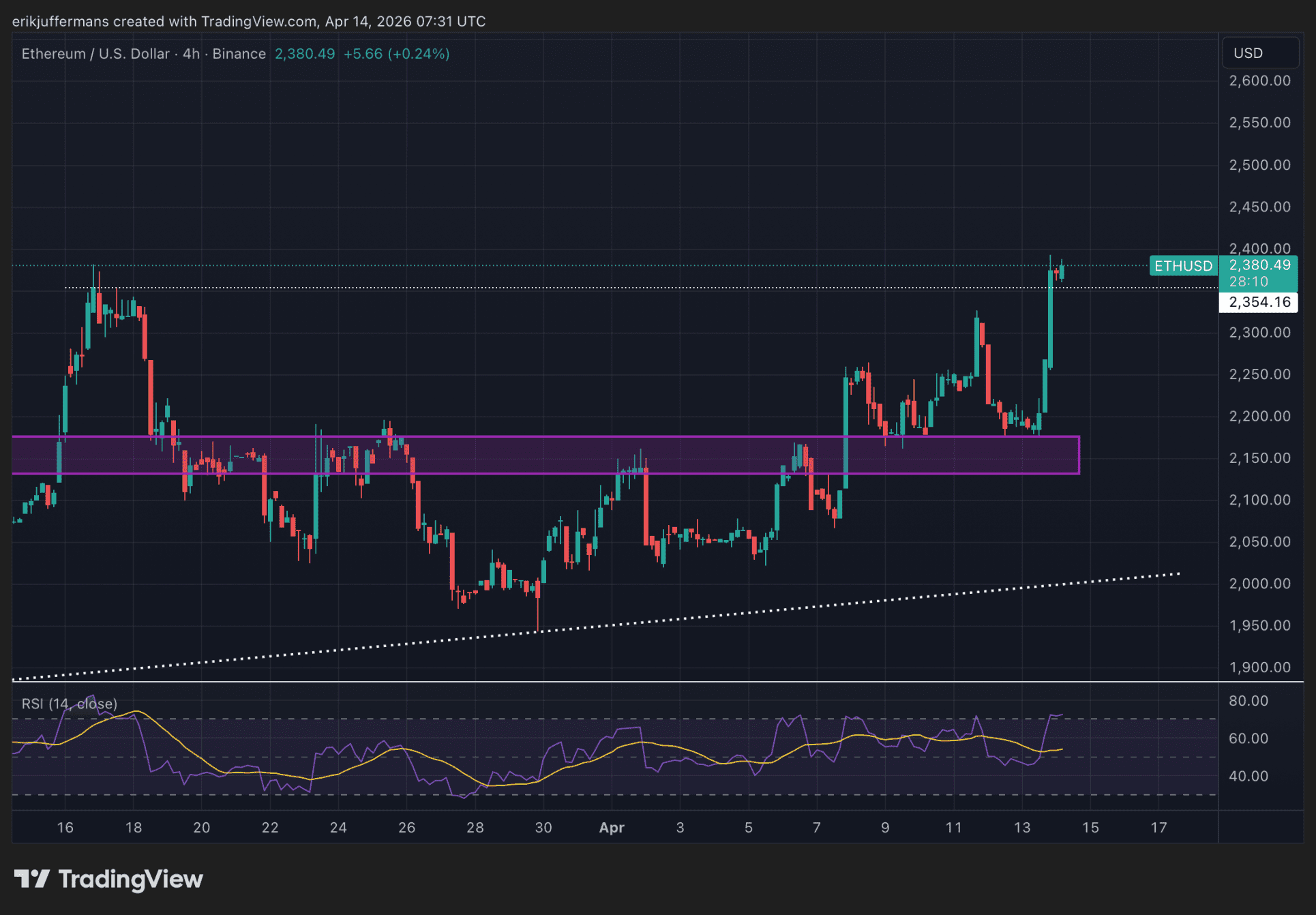 Gistermiddag zette ETH vanaf 2.170 dollar de stijging in en handelt nu op 2.380 dollar. Daarmee doorbreekt is de recente piek van 16 maart doorbroken. Er is dus nu officieel sprake van een higher high. Ook is de huidige koers het hoogste niveau sinds 1 februari. Hoe nu verder?