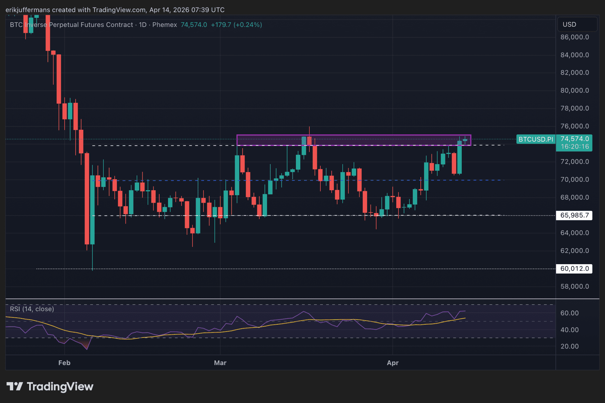 Op de vieruursgrafiek zien we dat ETH gisteren begon met stijgen na een mooie hertest van de paarse zone. Deze zone fungeerde eerder nog als weerstand maar werd vervolgens meerdere malen bevestigd als steun.