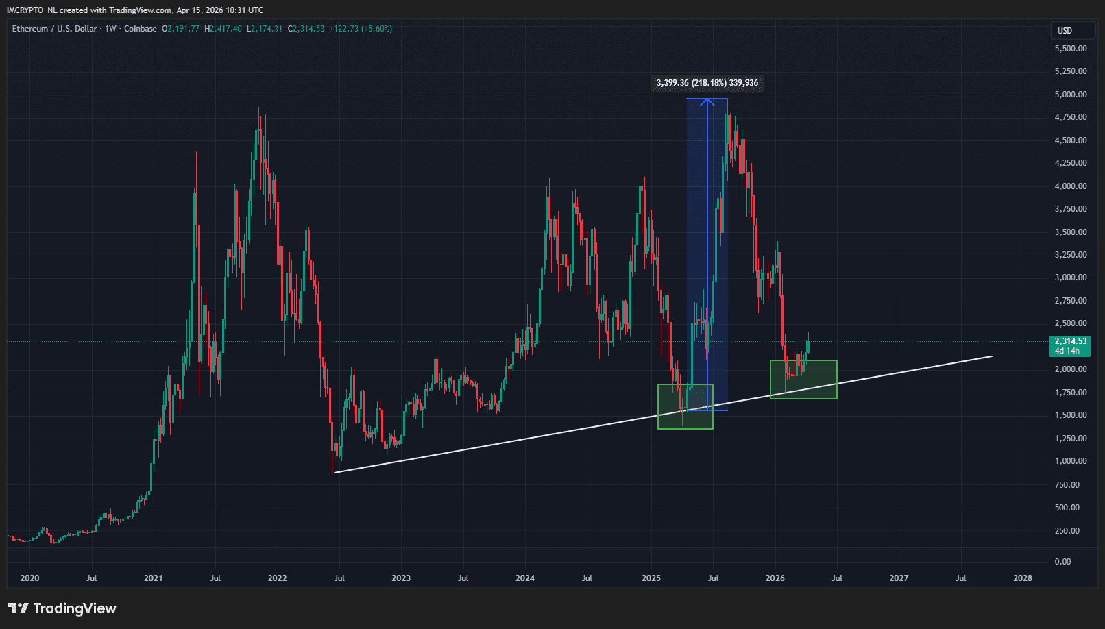 De groene zone laat zien wat er gebeurde na een vergelijkbare situatie in 2025. Ethereum zakte toen in april tot onder de 1.600. Daarna volgde een sterke rally van ongeveer 218 procent. In de zomer bereikte Ethereum toen een nieuwe all-time high van bijna 4.950 dollar.