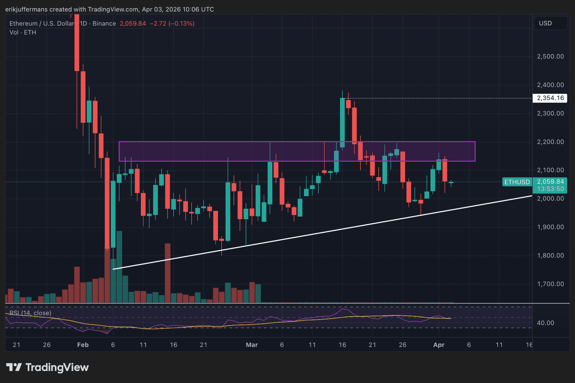 BTC brak recent door een belangrijke steunlijn die maandenlang als steun fungeerde. Ethereum daarentegen handelt nog altijd boven cruciale steunniveaus. We zien dat ETH in een duidelijk driehoekspatroon beweegt; een horizontale weerstandszone (paars) aan de bovenzijde en een oplopende steunlijn aan de onderzijde.