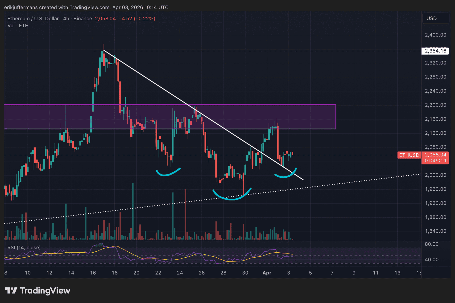 Zo’n patroon is een bullish patroon. Voor dit bullish scenario willen we wel een doorbraak van de paarse weerstandszone tussen pakweg 2.100 en 2.200 dollar zien. De koers wist vorige maand hier al een keer boven te komen, maar kon de zone toen niet omzetten in steun.