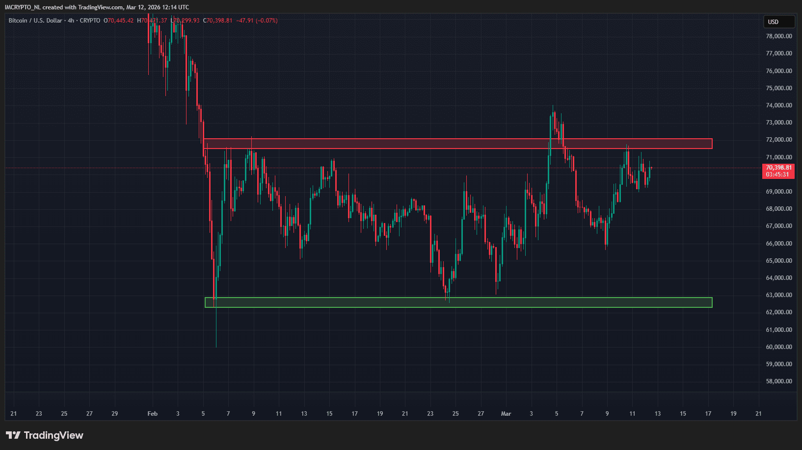 Maar we kunnen pas echt weer bullish worden als de koers boven de rode weerstandszone uitstijgt tussen grofweg 71.500 en 72.000 dollar. Voorlopig blijft het vastzitten in een eindeloze range.