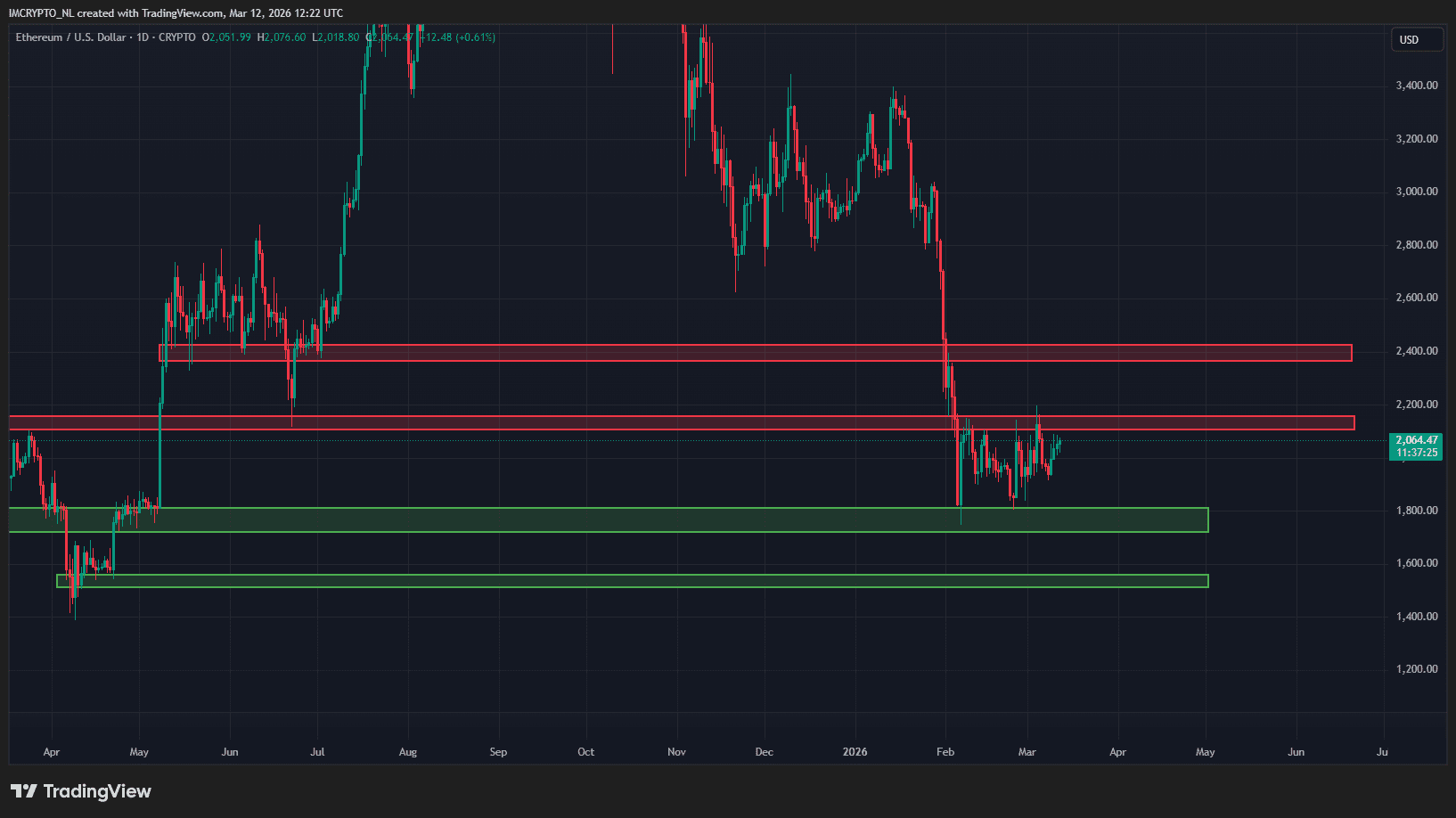 Dan Ethereum (ETH), de grootste altcoin van de markt. Ook daar zien we een vierde achtereenvolgende groene dag ontstaan. En wederom zit de koers gevangen tussen twee belangrijke levels.