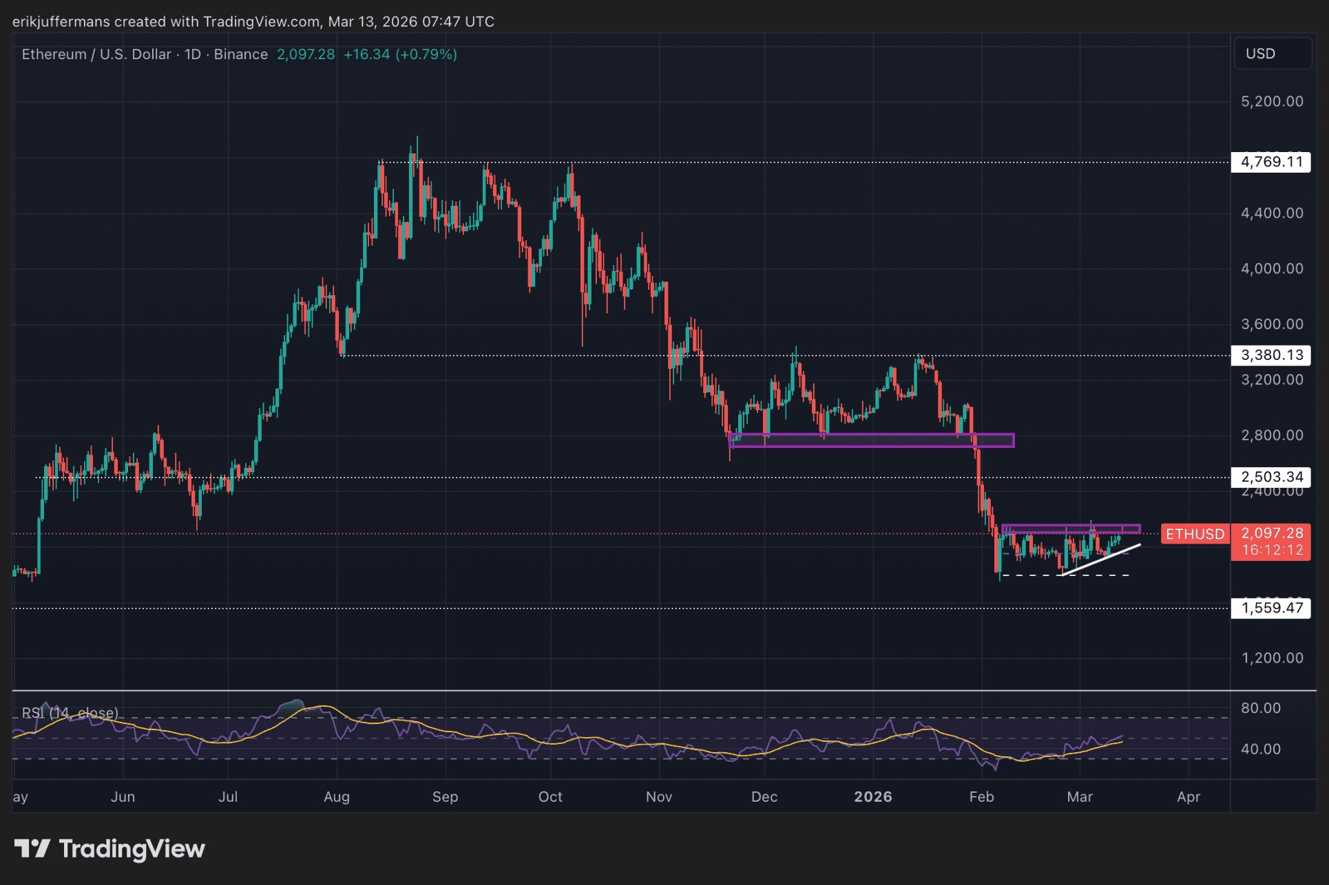 Tegelijkertijd ziet de structuur op de grafiek er wel steeds sterker uit. Sinds de bodem rond 1.800 dollar maakt ETH hogere bodems en bouwt het langzaam momentum op richting de weerstand. Dat kan erop wijzen dat de verkoopdruk langzaam afneemt.