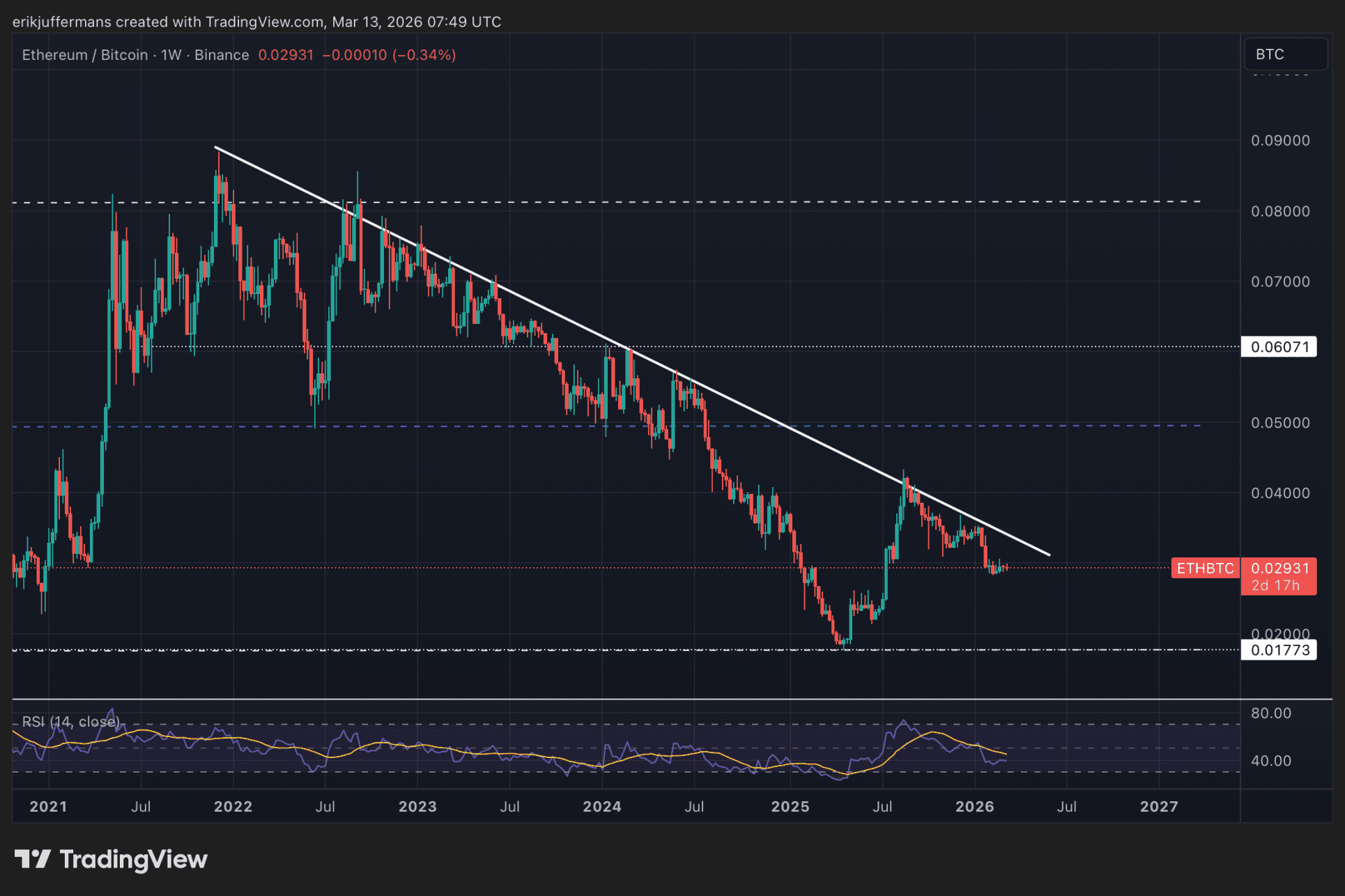 Tot slot is het interessant om naar de ETH/BTC-grafiek te kijken. Deze verhouding laat zien hoe Ethereum presteert ten opzichte van Bitcoin.