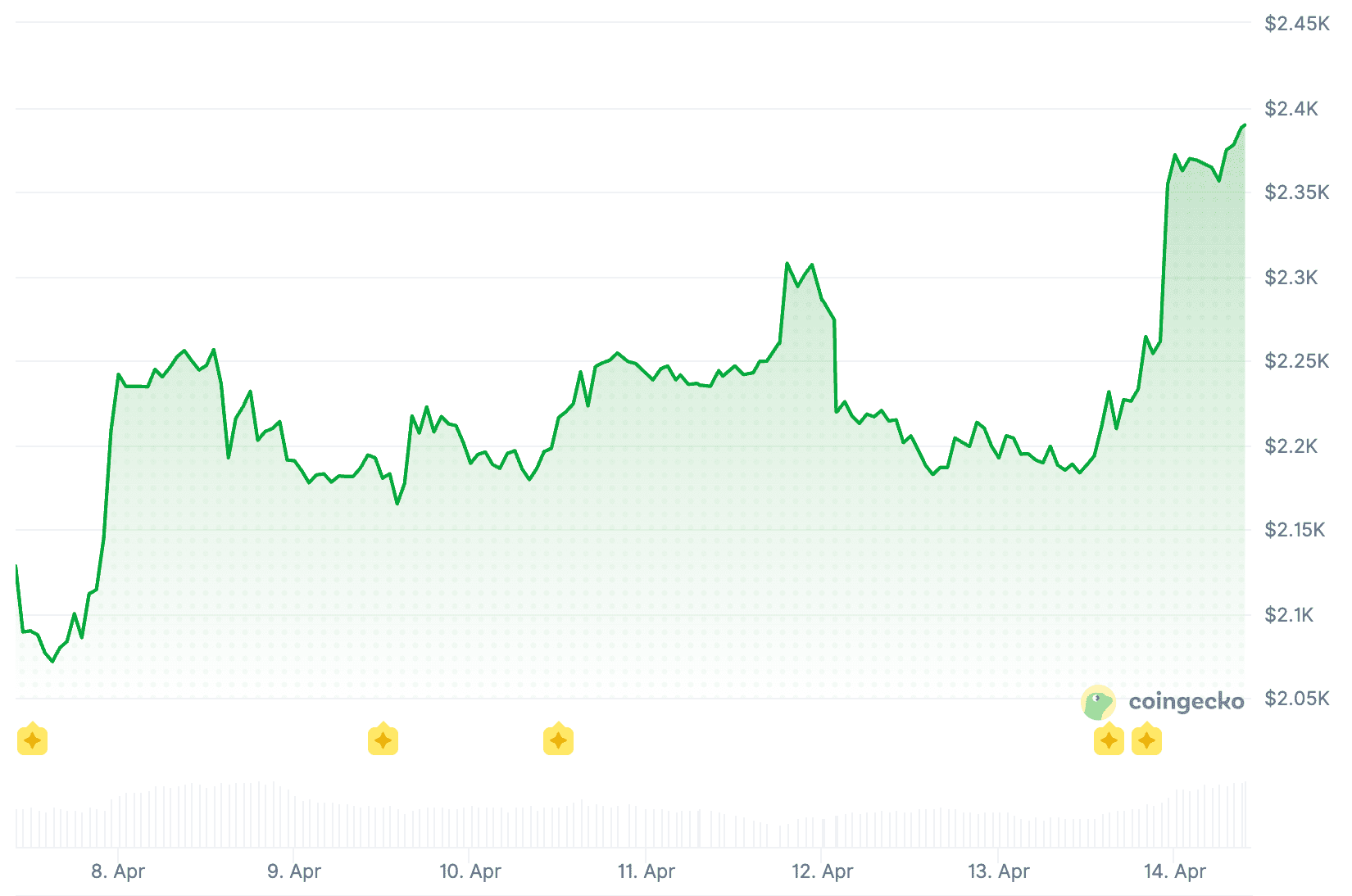 De verschuiving naar ETH zien we ook terug in de koersprestaties. In de afgelopen 24 uur steeg de Ethereum koers met maar liefst 9,2 procent tot ruim 2.380 dollar. Daarmee bereikt de munt het hoogste niveau sinds begin februari.