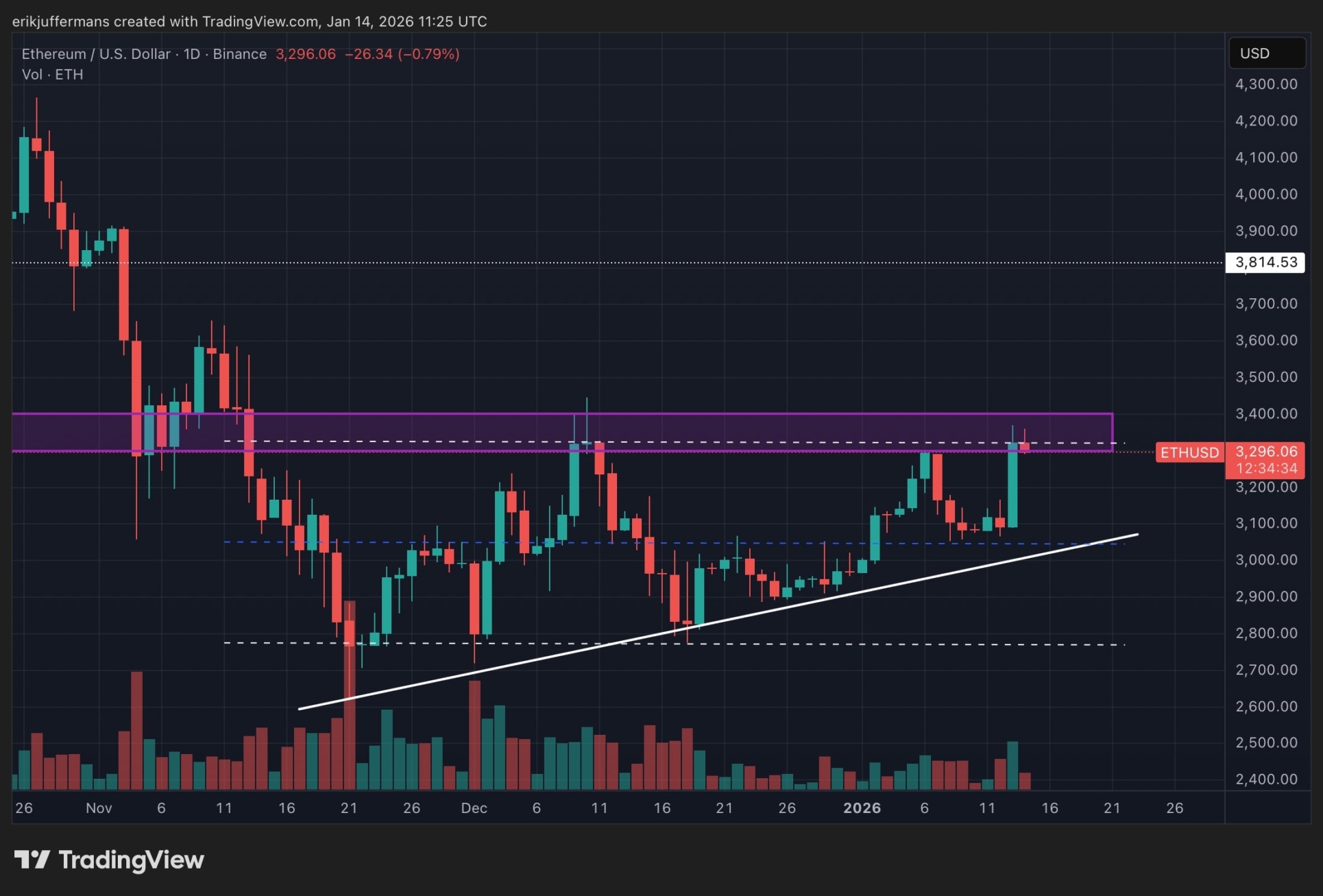 Op de grafiek hieronder is te zien dat de koers nog steeds onder de paarse weerstandszone handelt. Mocht het momentum van BTC doorzetten is de kans echter groot dat ook ETH snel met de weerstand zal afrekenen.