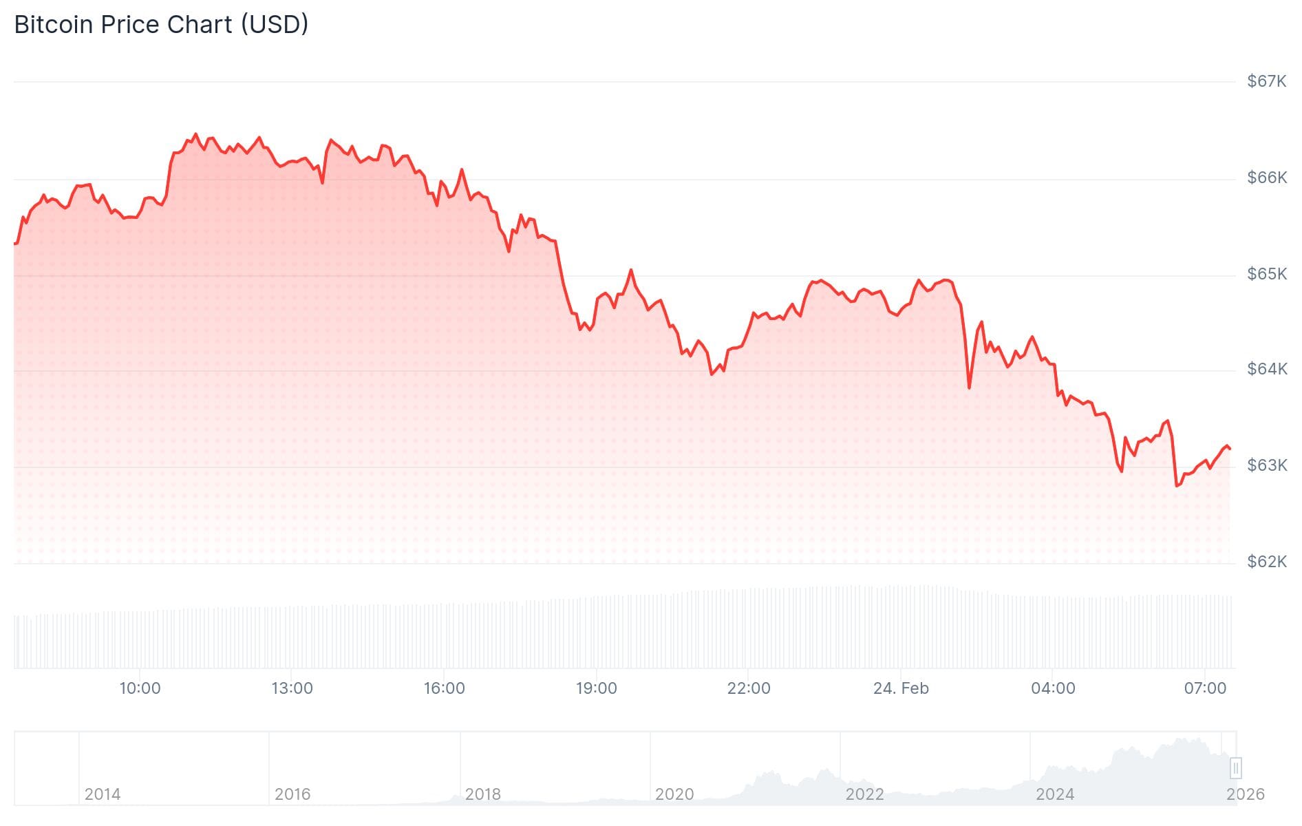 Vanmorgen om 06:30 uur werd het laagste punt bereikt van 62.700 dollar en inmiddels handelt de grootste crypto op 63.200 dollar. Het huidige niveau is 3,61 procent lager dan 24 uur geleden.