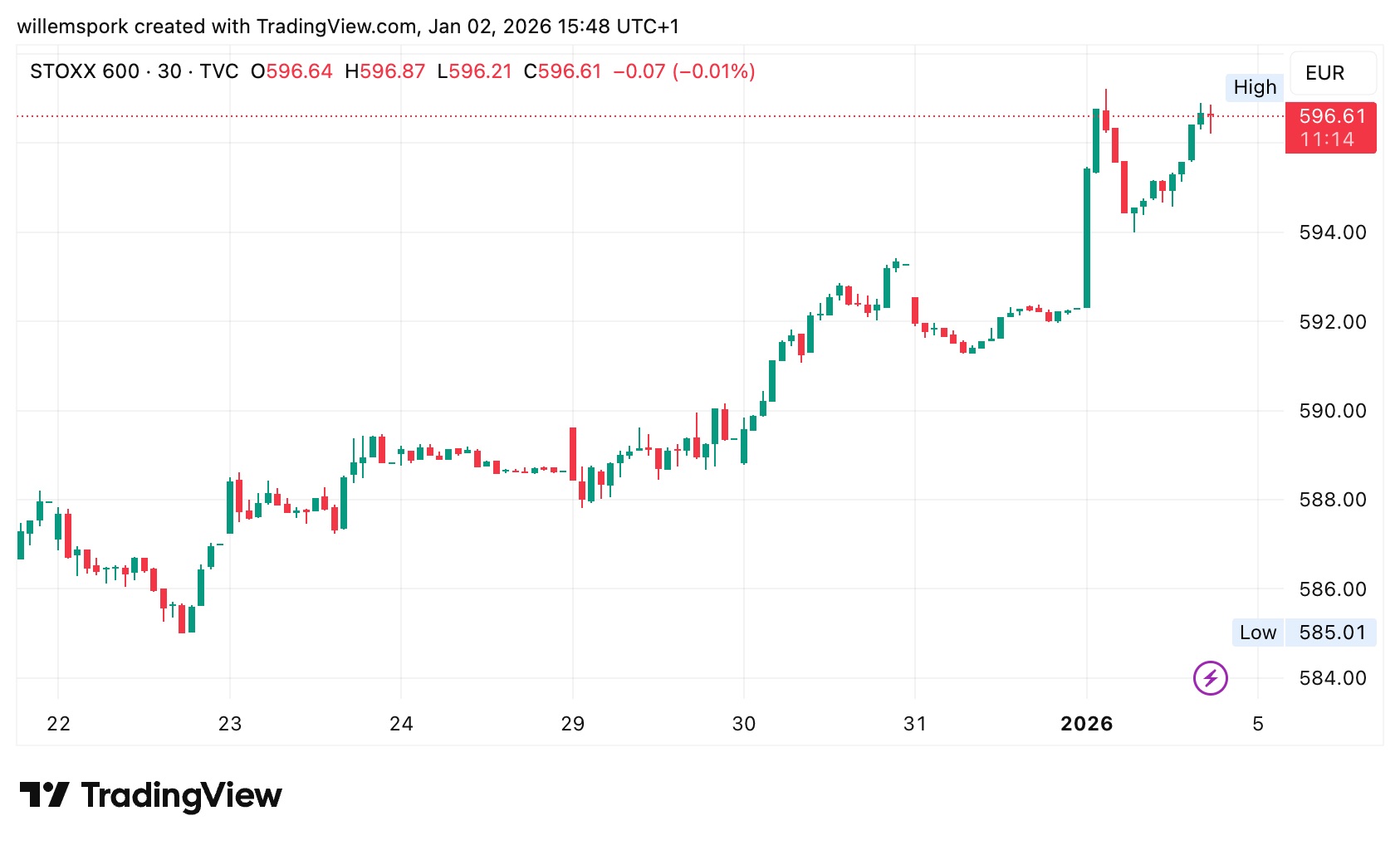De Stoxx Europe 600 stond aan het einde van de ochtend 0,77 procent hoger op 596,75 punten. Daarmee zet de index zijn opmars voort na een stijging van bijna zestien procent in 2025. Ook andere Europese beurzen kleurden groen: de FTSE 100 doorbrak eerder op de dag voor het eerst de grens van 10.000 punten, voordat de winst iets afzwakte. De Duitse DAX en Franse CAC 40 boekten eveneens winst van ongeveer een halve procent.