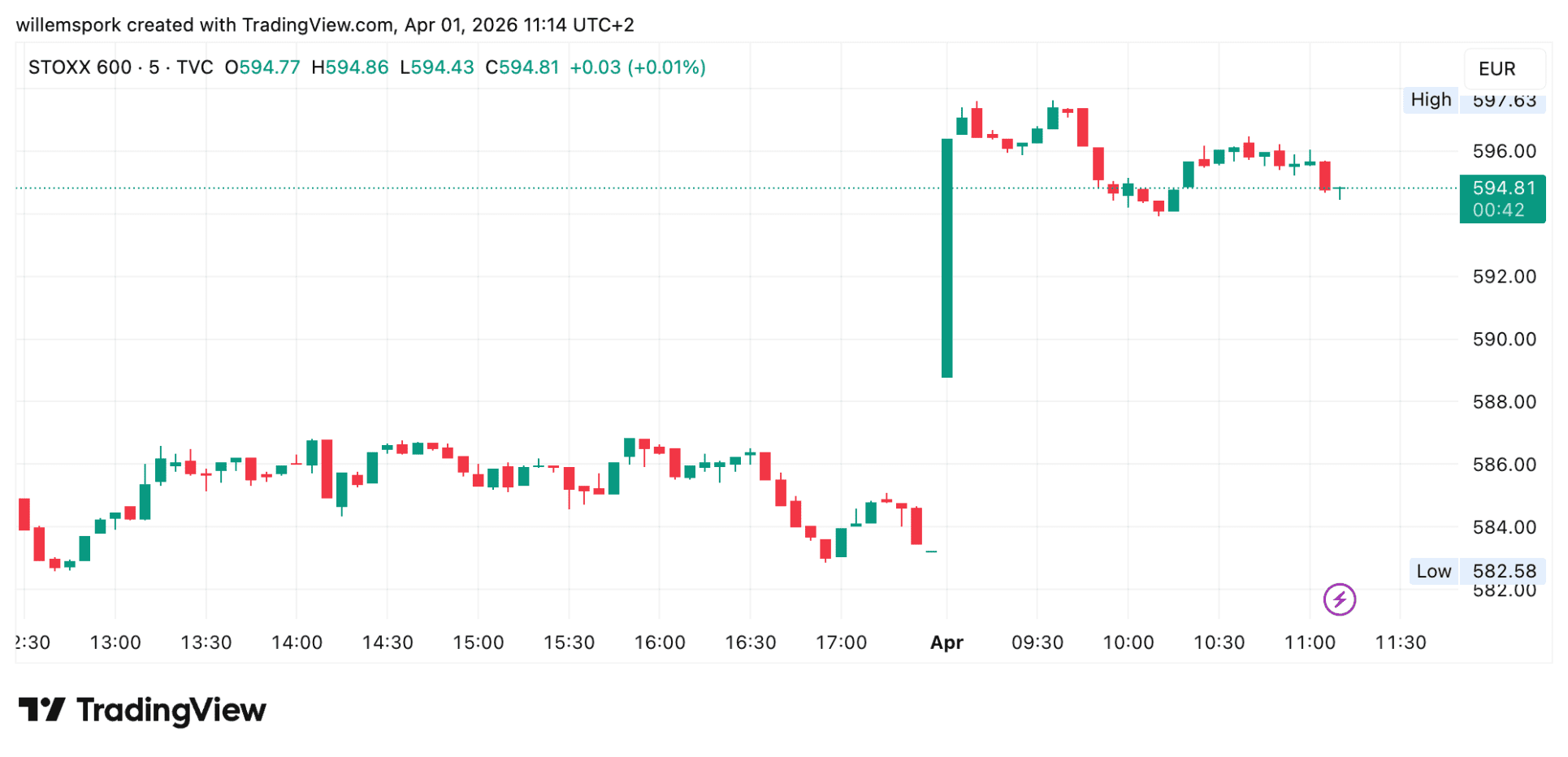 De Stoxx Europe 600 index stijgt met ongeveer twee tot tweeënhalf procent en noteert daarmee de sterkste dag in ruim een jaar. Vrijwel alle sectoren bewegen hoger, met uitzondering van energieaandelen.