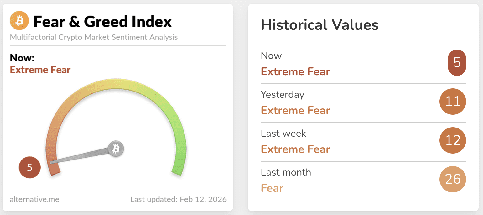 Met een stand van 5 bevindt de markt zich in een van de meest pessimistische fases van de afgelopen jaren. Opvallend is vooral de snelheid van de verslechtering: binnen enkele weken gleed het sentiment van angst naar pure paniek, parallel aan dalende koersen van grote cryptomunten.