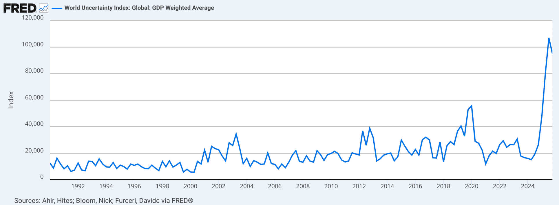 De verslechtering van het cryptosentiment valt samen met een sterke stijging van de mondiale economische onzekerheid. Internationale indicatoren laten zien dat zorgen over geopolitiek, beleid en financiële markten inmiddels niveaus hebben bereikt die hoger liggen dan tijdens eerdere crises, zoals de coronapandemie en de eurocrisis.