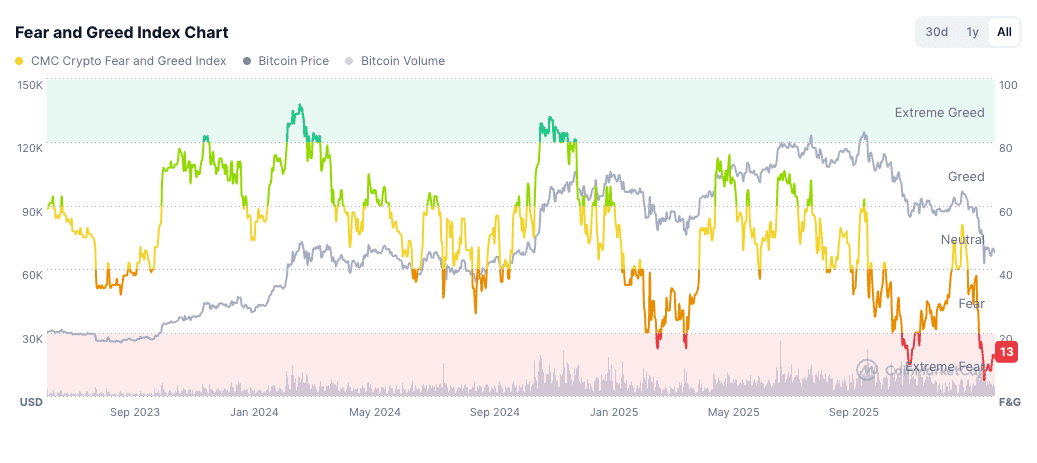 Het sentiment op de cryptomarkt is gezakt naar het laagste niveau in vier jaar. De Fear and Greed Index staat op slechts 13 op 100, wat duidt op ‘extreme angst’ onder beleggers.