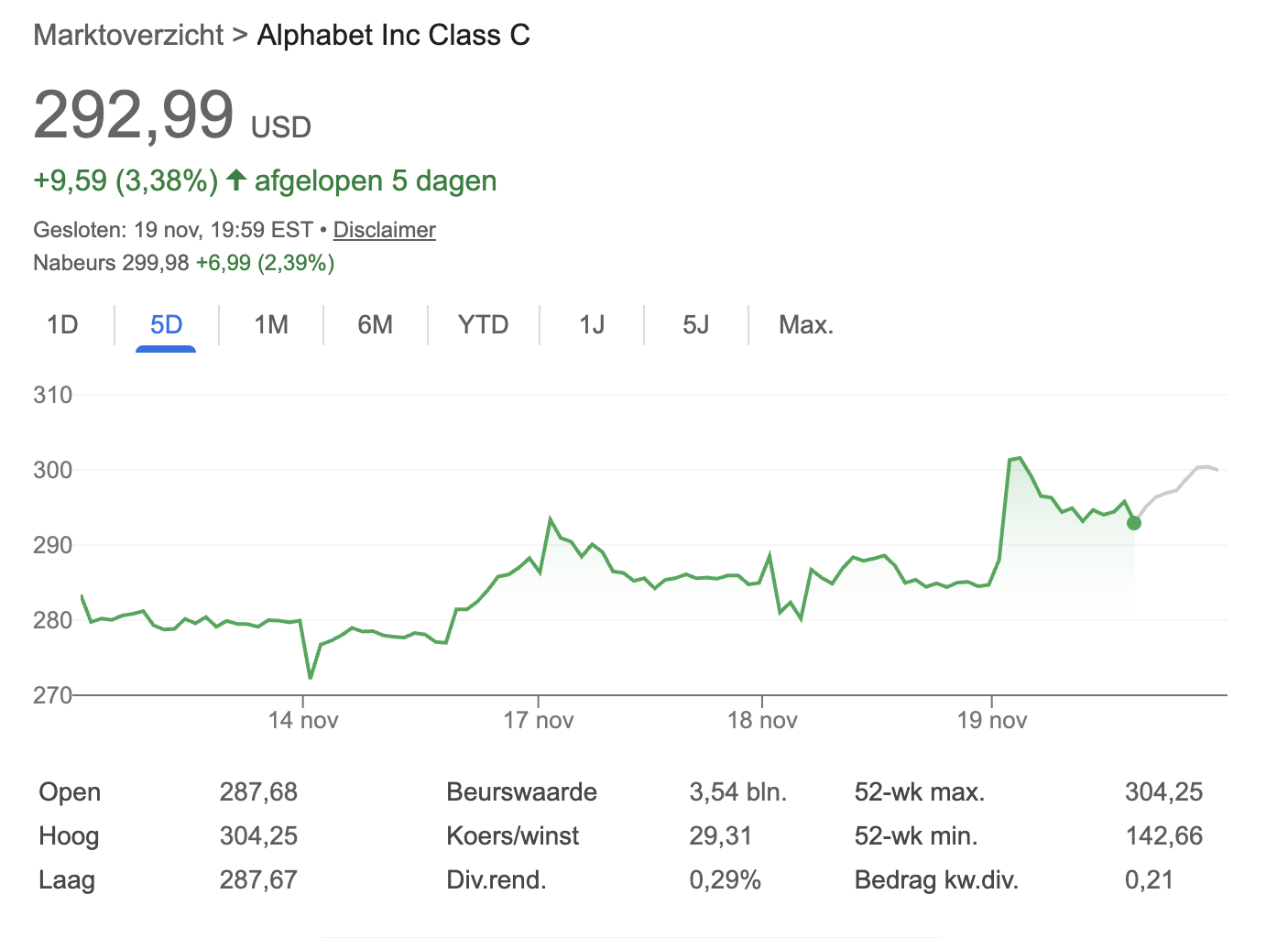 De markt reageerde enthousiast op de aankondiging. Het aandeel Alphabet steeg direct met 6,7 procent en tikte een nieuwe all-time high aan van 304 dollar. Later op de dag zakte de koers iets terug naar 299,98 dollar.