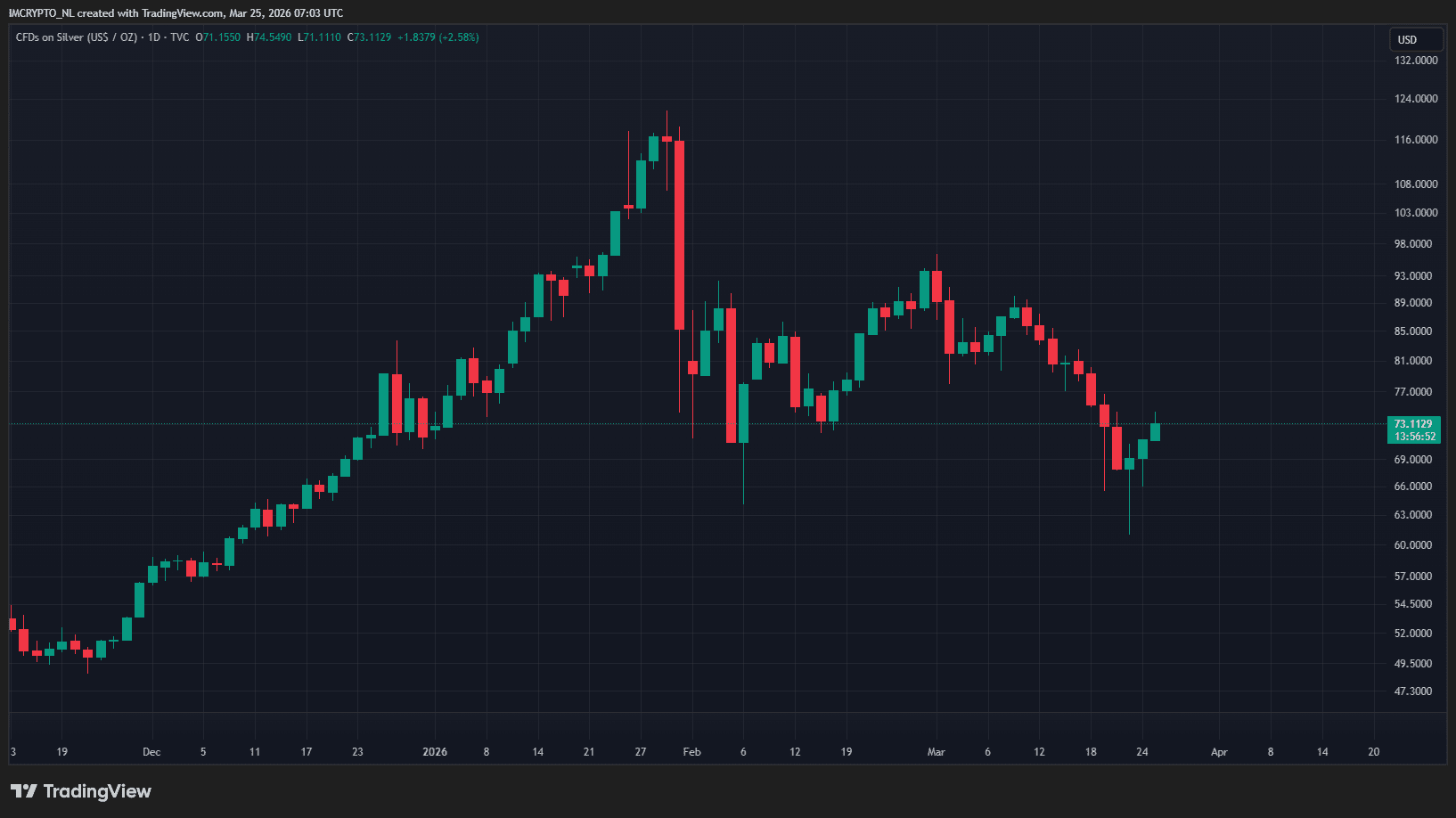 Zilver is met 4,75 procent gesgtegen naar een piek van 74,55 dollar en wordt nu verhandeld voor 73,09 dollar.