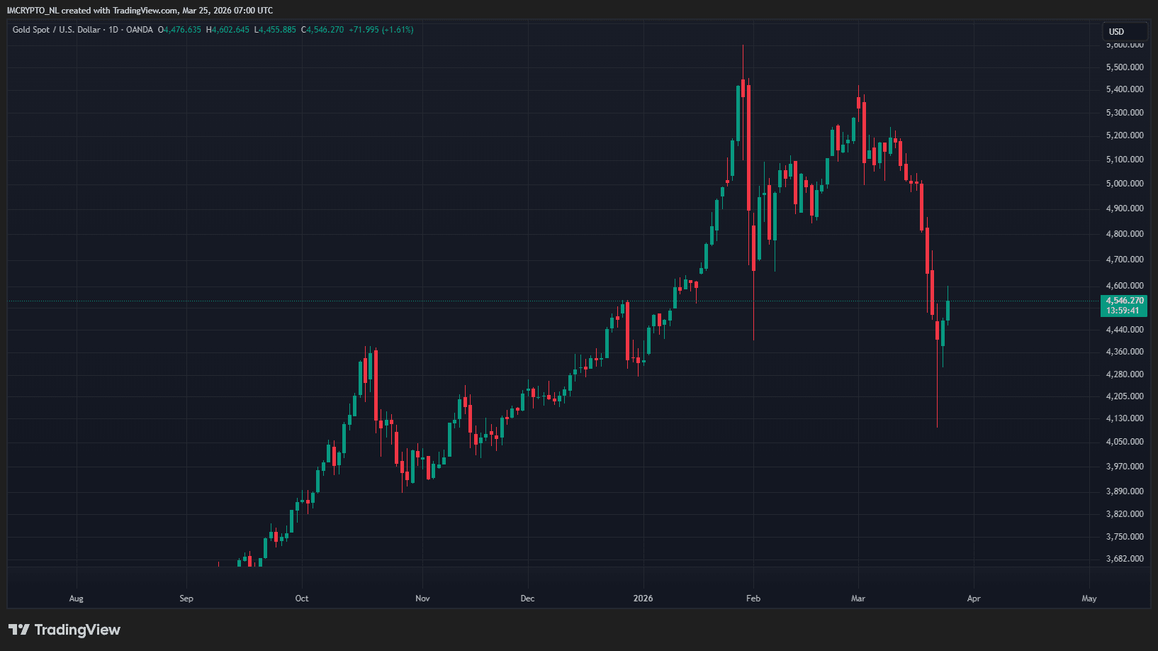 De goudprijs is vandaag al met meer dan 4 procent gestegen naar 4.602 dollar per troy ounce (dat is iets meer dan 31 gram). Op het moment van schrijven staat de koers op 4.547 dollar.