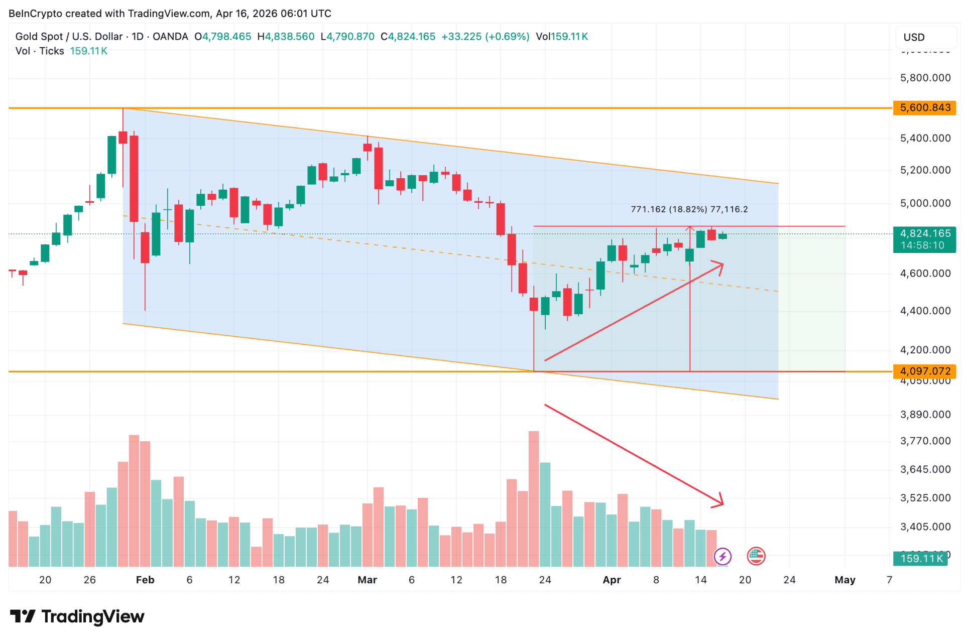 De goudprijs is sinds de bodem van 23 maart met ongeveer 18 procent gestegen naar 4.824 dollar per ounce. Op papier ziet dat eruit als een krachtige comeback. Toch zijn er volgens de analisten van BeInCrypto meerdere signalen die laten zien dat deze opleving minder sterk kan zijn dan ze lijkt.