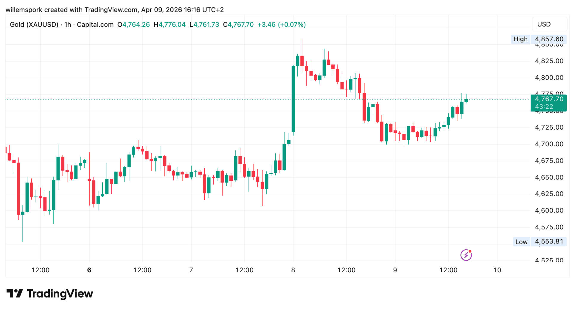 De goudprijs stond eerder op de dag nog lager, maar is in de middag duidelijk opgeveerd. Volgens de meest recente marktupdate steeg goud naar ongeveer 4.764 dollar per ounce. Dat ligt boven het niveau van eerder vandaag, toen spotgoud nog rond 4.707 dollar noteerde.