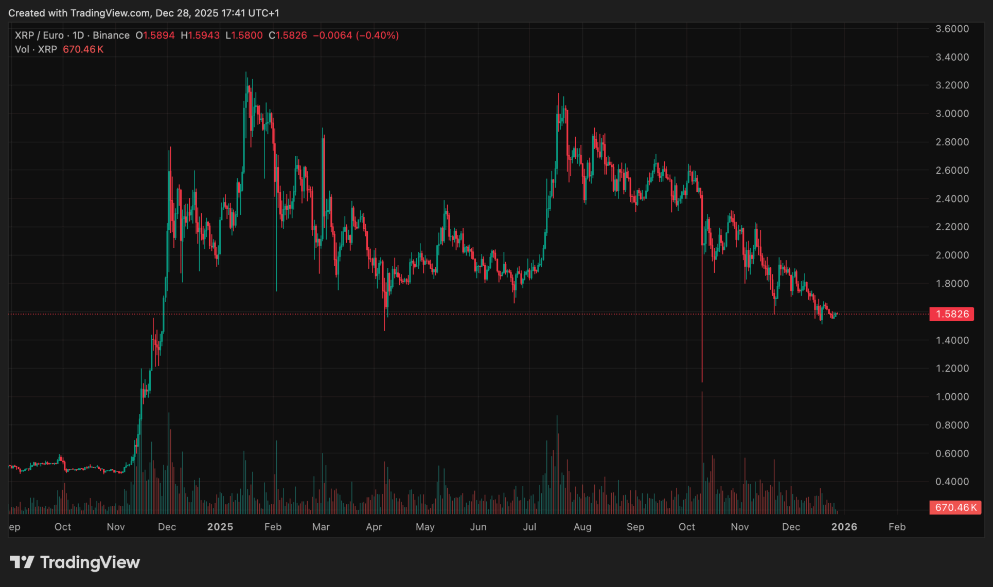 Deze ontwikkelingen hadden XRP in theorie tot een van de winnaars van het jaar moeten maken. Toch bleef de koers achter. Elke stijging boven de 2 euro werd snel weer verkocht. Het sentiment op de bredere cryptomarkt bleef zwak, mede door volatiliteit, escrows en een afwachtende houding bij beleggers.