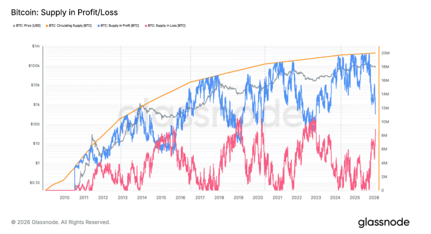 Volgens Glassnode staat momenteel ongeveer 11,1 miljoen Bitcoin in winst. Daartegenover staat 8,9 miljoen BTC die in verlies verkeert. Dat verschil wordt nu steeds kleiner met een Bitcoin koers die steeds verder aan het dalen is.