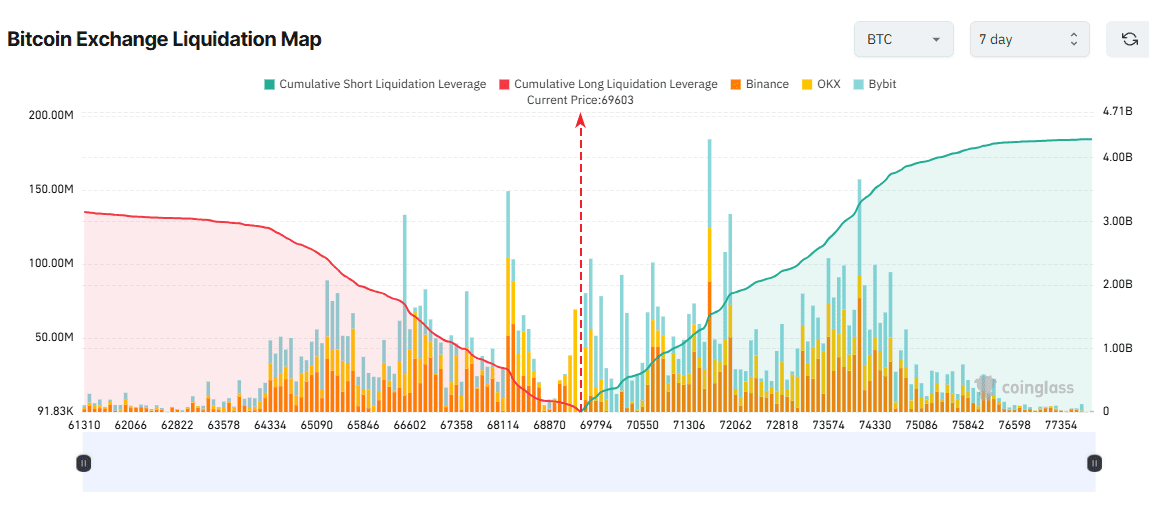 Het echte explosieve element zit echter in de liquidatiekaarten van de markt. Analyseplatform Coinglass laat zien dat er rond de 75.000 dollar een enorme hoeveelheid shortposities ligt die gedwongen gesloten kunnen worden.