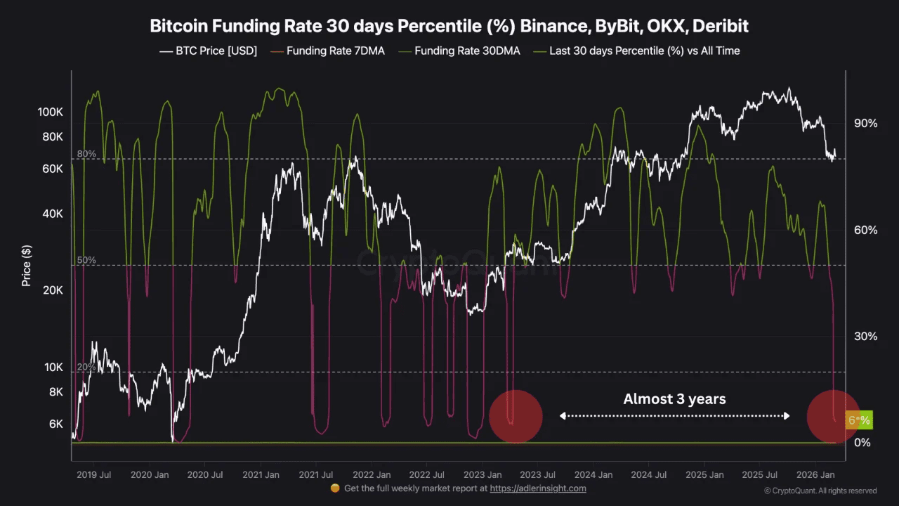 De belangrijkste aanwijzing daarvoor komt uit de zogenoemde funding rates op derivatenbeurzen. Die funding rate geeft aan of er meer handelaren inzetten op een stijging of daling van Bitcoin: