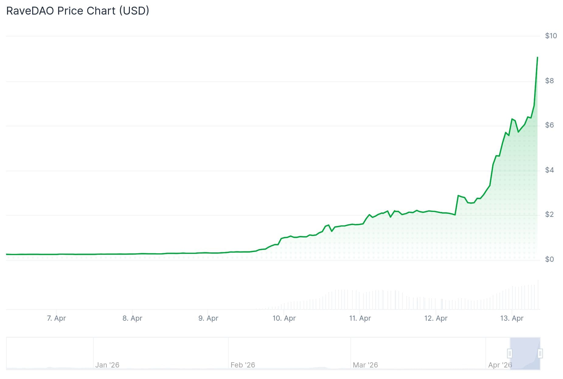 Vlak vóór de jaloersmakende rally bedroeg het 24-uursvolume zo’n 22 tot 27 miljoen dollar en op 10 april explodeerde dat naar bijna 400 miljoen dollar. Over de afgelopen dag is er zelfs al voor 666 miljoen dollar aan RAVE-munten verhandeld.