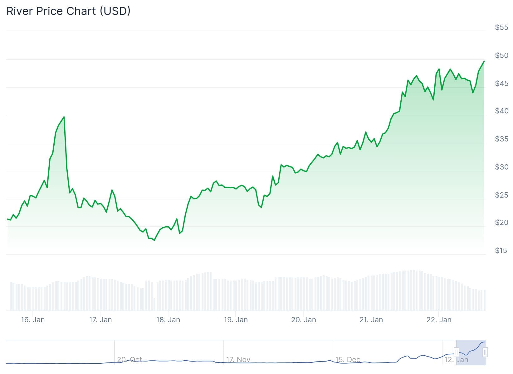 RIVER bereikte een nieuwe all-time high van 48,21 dollar, waarna het in de opvolgende uren haar momentum verloor.