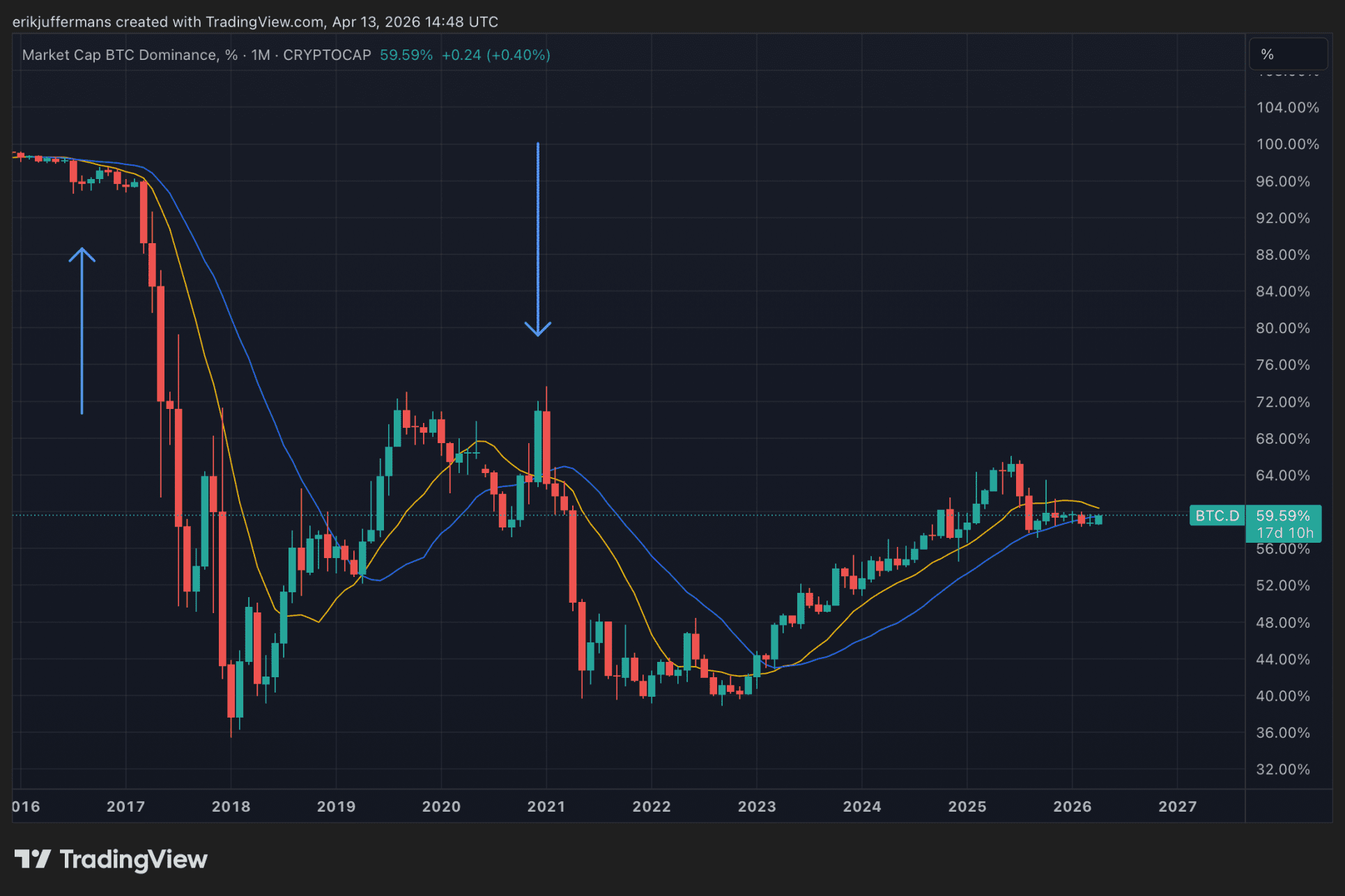 De Bitcoin-dominantie is het totale marktaandeel van Bitcoin (BTC) binnen de cryptomarkt, uitgedrukt als percentage. De bijbehorende grafiek staat bekend als de BTC.D-grafiek. Op die grafiek zien analisten momenteel een death cross naderen. Maar wat houdt dat precies in?