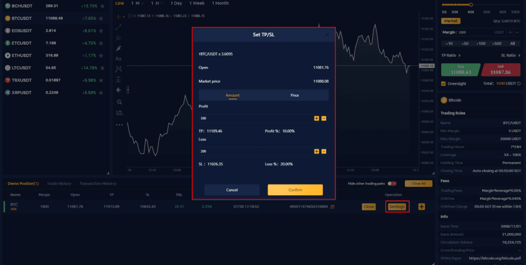 Als je de aankoop hebt bevestigd klik je onderin het scherm op het knopje ‘settings’. Hier stel je in bij welk bedrag je winst wilt nemen en waar je je stop loss wilt plaatsen. Als je dit naar wens hebt ingesteld klik je op ‘confirm’ om je instellingen te bevestigen.