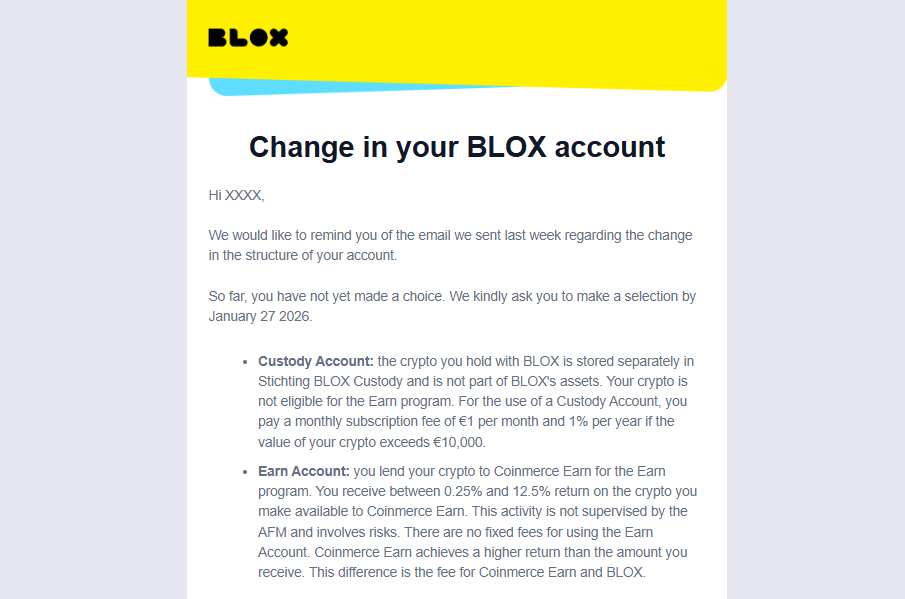 Op 8 december maakte BLOX bekend te stoppen met de kosteloze opslag van cryptomunten, zoals Bitcoin (BTC) en Ethereum (ETH). Gebruikers moeten kiezen tussen een betaald custody account of een zogenoemd earn account.