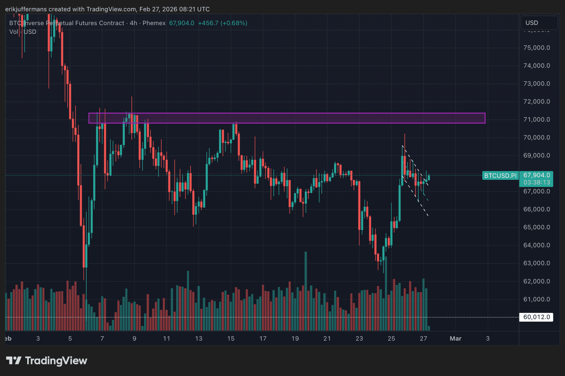 Maar zover zijn we nog niet. De eerste horde is de weerstand rond 71.000 dollar. En de koers lijkt dit niveau de komende dagen te gaan testen.Â