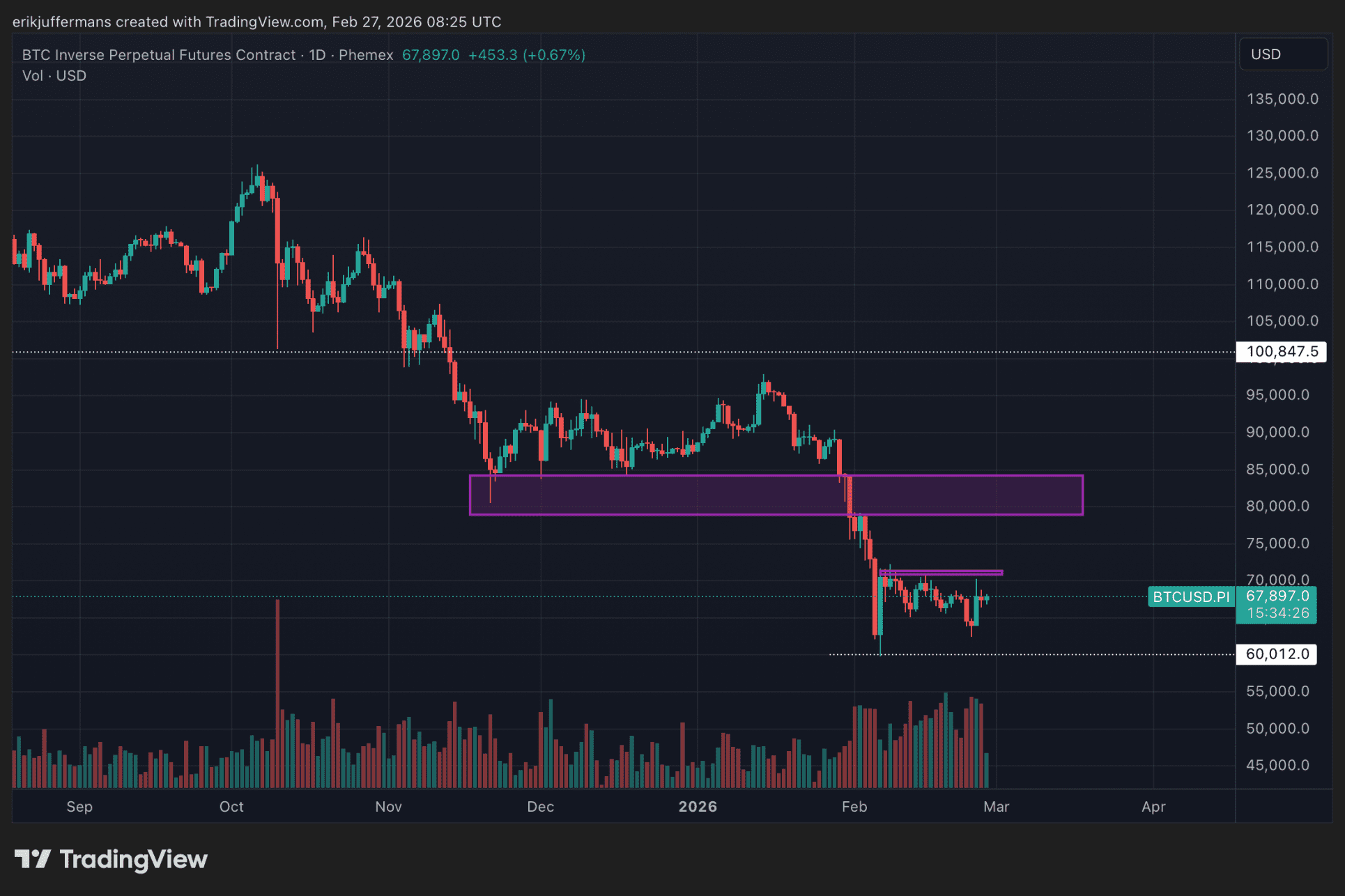 De maandelijkse grafiek benadrukt het belang van de eerder genoemde zone rond 80.000 dollar. Mocht de koers dit niveau heroveren dan zou Bitcoin terugkomen in de range waar de koers het grootste deel van de afgelopen twee jaar in handelde.