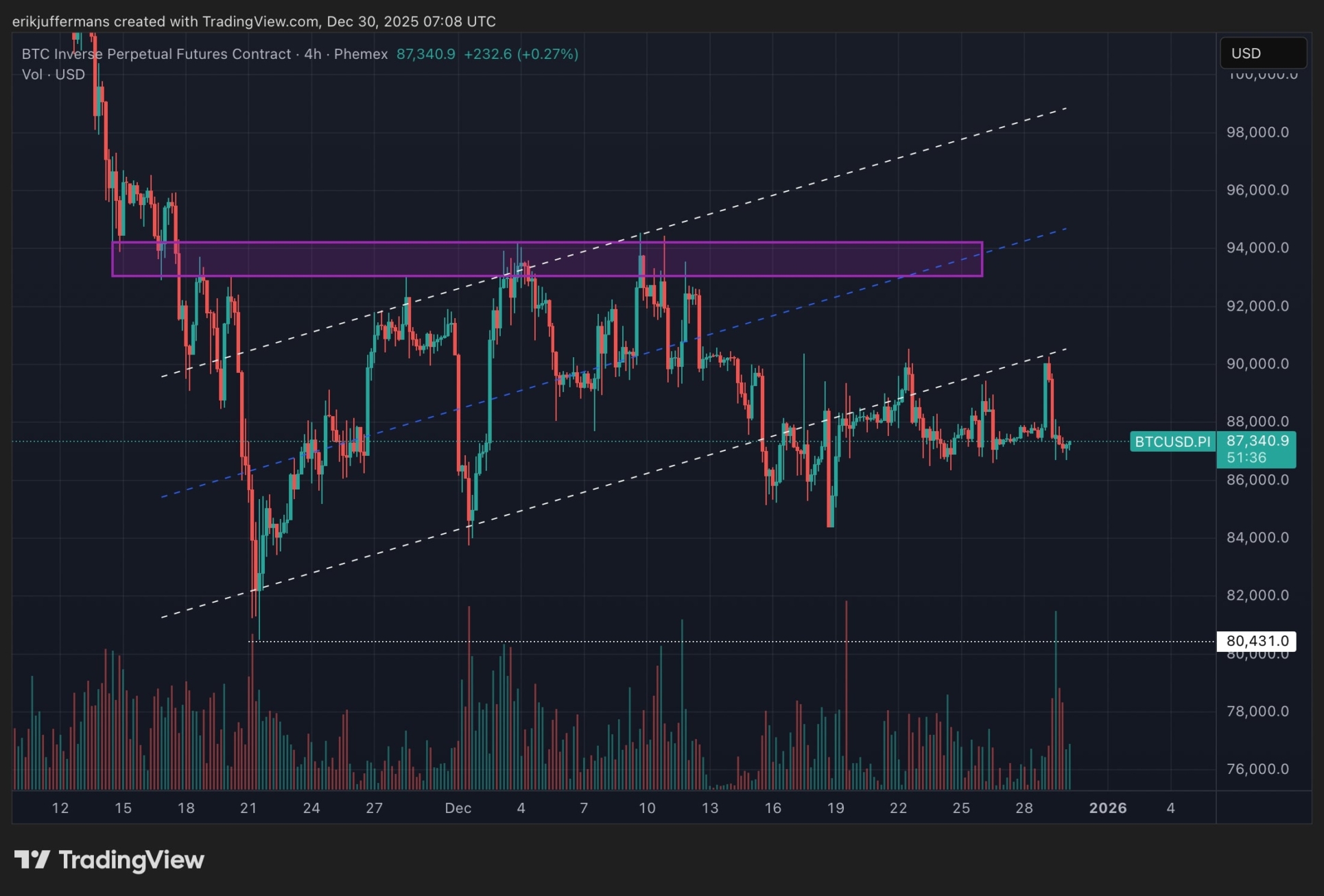 Als we iets inzoomen is de actuele situatie wat beter te beoordelen. Zoals gezegd kunnen we met de start van januari een terugkeer van de volatiliteit verwachten. De kans is dan ook erg klein dat de koers lang tussen de kleine range van 87.000 tot 90.000 dollar zal handelen.
