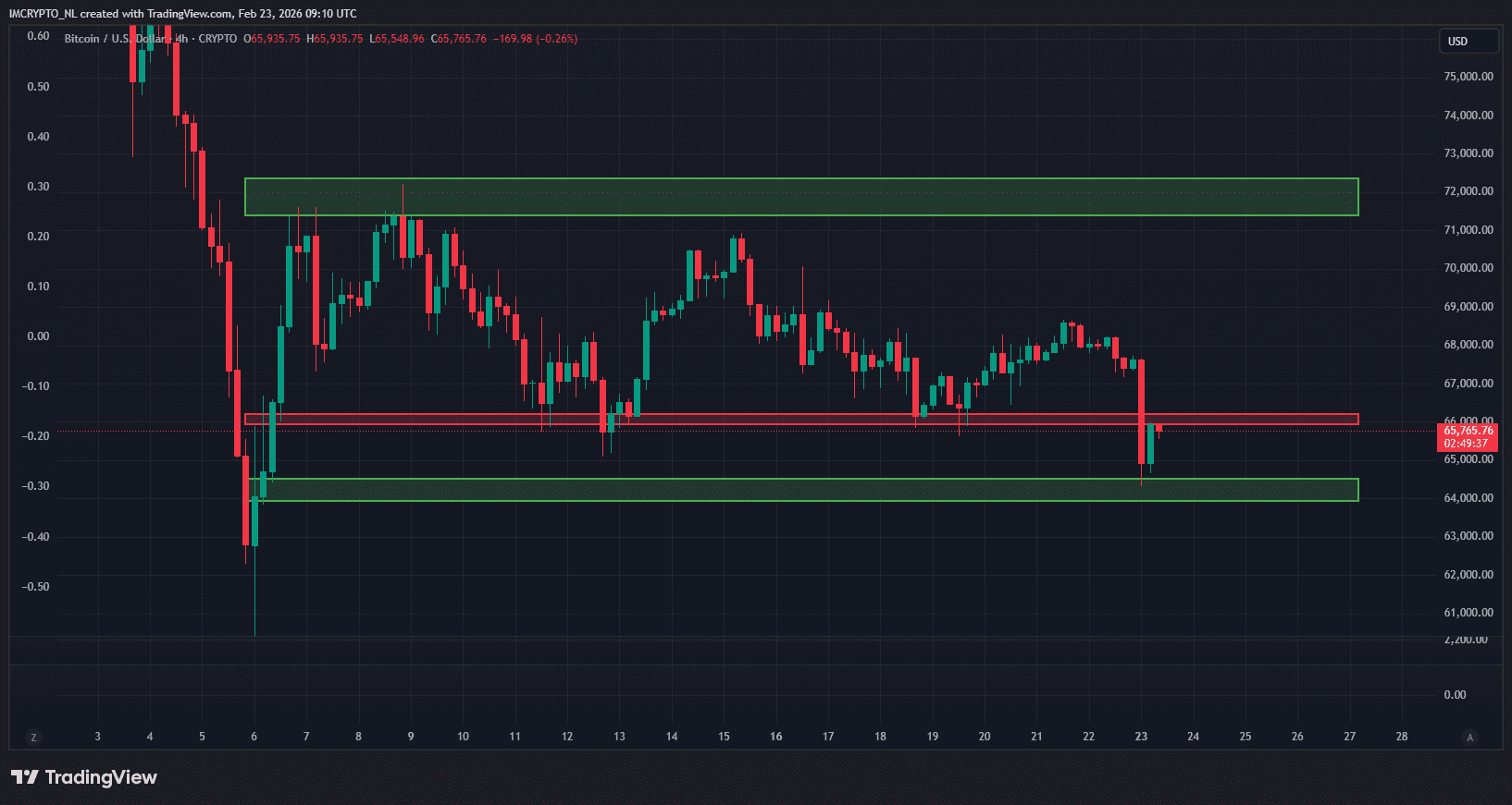 Dit keer is Bitcoin doorgeschoten naar het volgende steunpunt rond de 64.000 dollar. Oftewel de groene zone in onderstaande grafiek. Om 03:00 uur werd de bodem bereikt en vanmorgen rond 09:00 uur stond het alweer op 66.000 dollar.