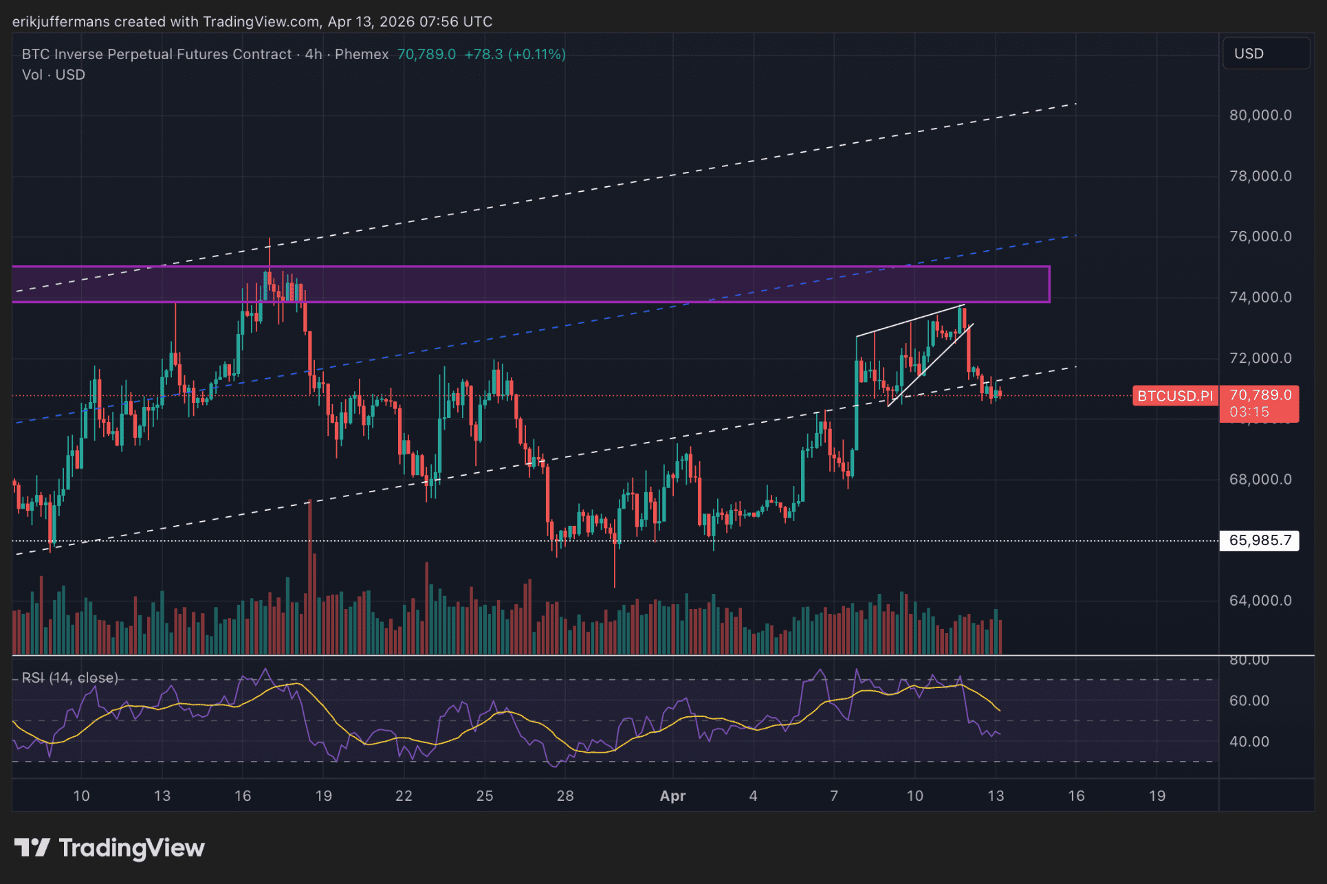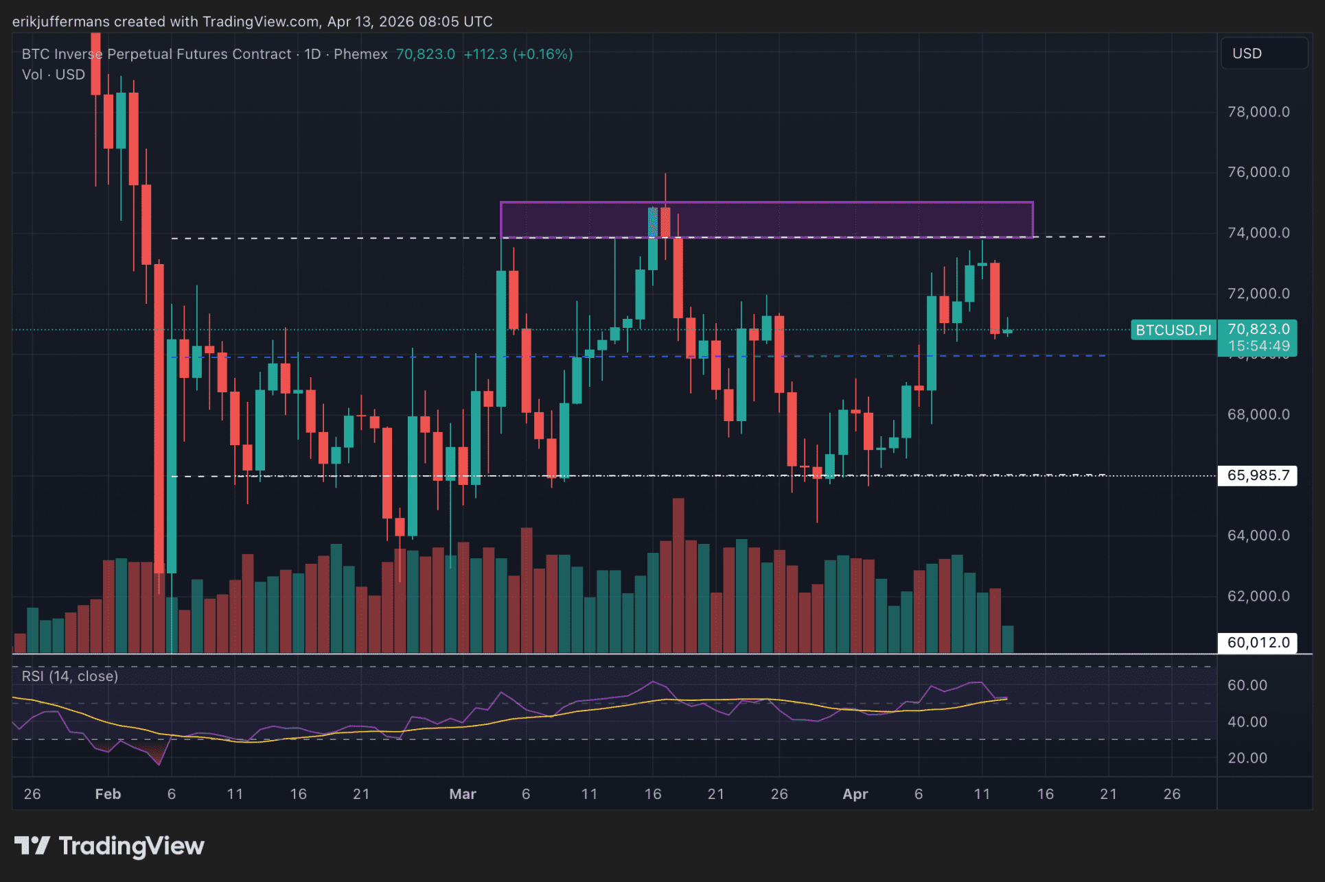 De bovengrens ligt hierbij tussen 74.000 en 75.000 dollar en de ondergrens rond de 65.000 á 66.000 dollar. De zone rond 70.000 dollar valt hierbij exact in het midden.
