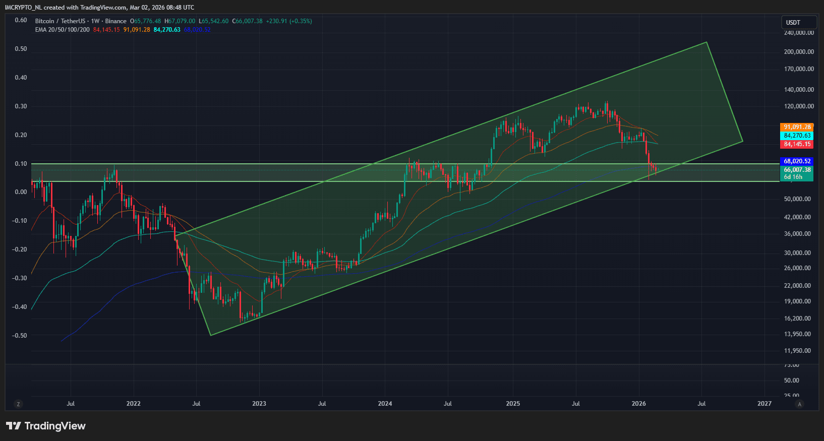 Als we even wat verder uitzoomen dan zien we dat Bitcoin zich op een interessant punt bevindt op de wekelijkse grafiek. Namelijk de onderkant van het diagonale kanaal waar het al sinds begin 2023 in beweegt.