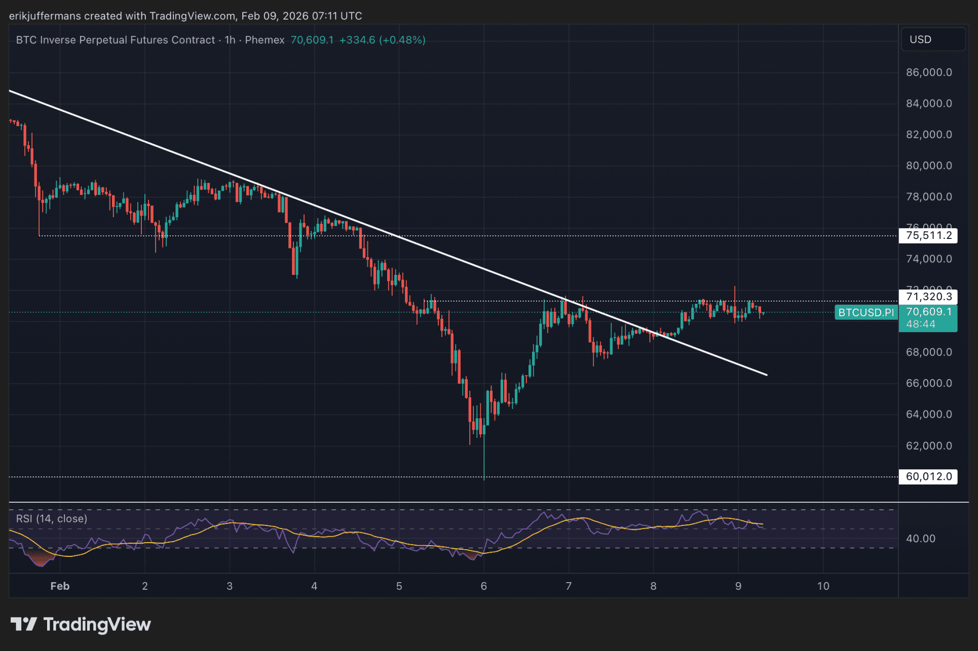 Een doorbraak boven 71.000 dollar kan volgens Juffermans ruimte geven voor een stijging richting 75.000 dollar. Wordt de koers hier opnieuw afgewezen, dan ligt een nieuwe daling onder 70.000 dollar voor de hand. In dat scenario is een tweede test van de recente bodem rond 60.000 dollar zeker niet uitgesloten.