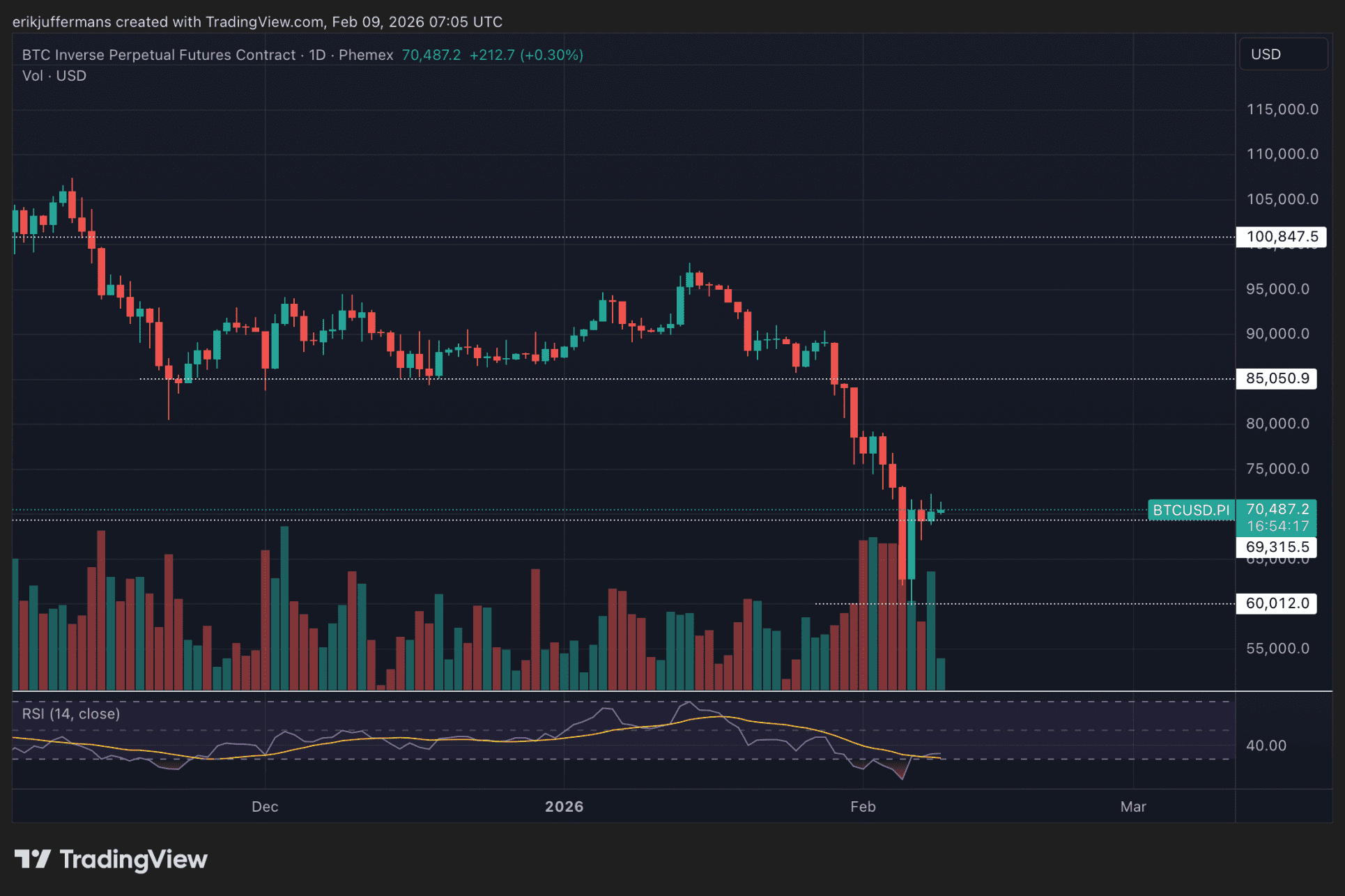 Volgens Erik Juffermans vergroot dit de kans dat dit gebied uiteindelijk als macrobodem gaat fungeren. Dat proces hoeft echter niet snel te verlopen. Een langere periode van consolidatie ligt voor de hand, waarbij scherpe uitschieters op lagere timeframes mogelijk blijven. Voor een structureel herstel blijft het cruciaal dat de wekelijkse candles boven 69.000 dollar blijven sluiten.
