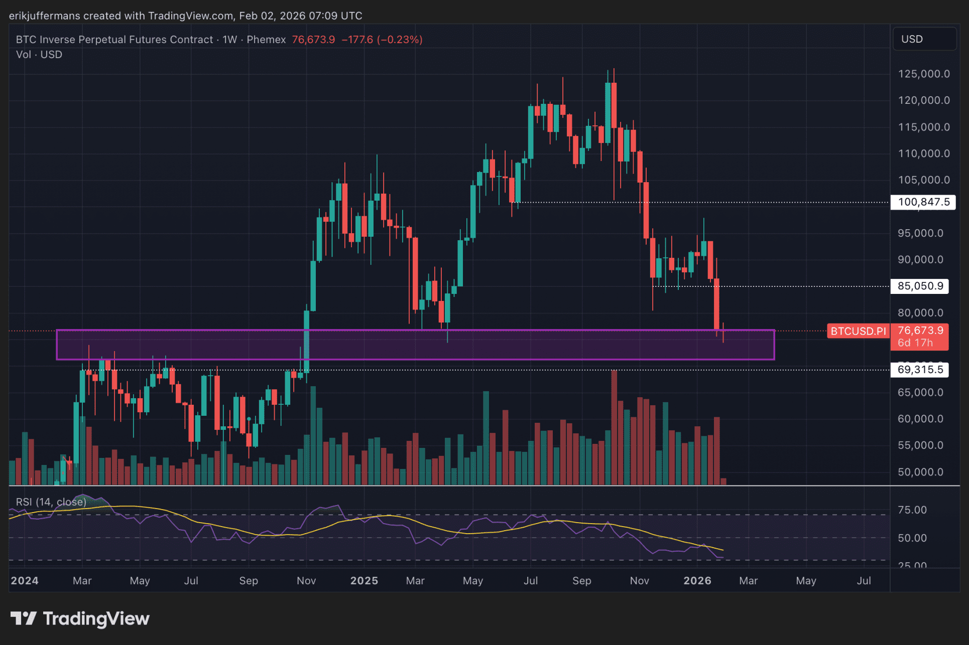Ook op de wekelijkse grafiek springt het huidige koersgebied in het oog. In april vorig jaar daalde Bitcoin eveneens tot deze zone. Dat bleek toen het startpunt van een nieuwe opwaartse beweging. Uiteindelijk leidde die rally zelfs tot het all-time high van 126.000 dollar.