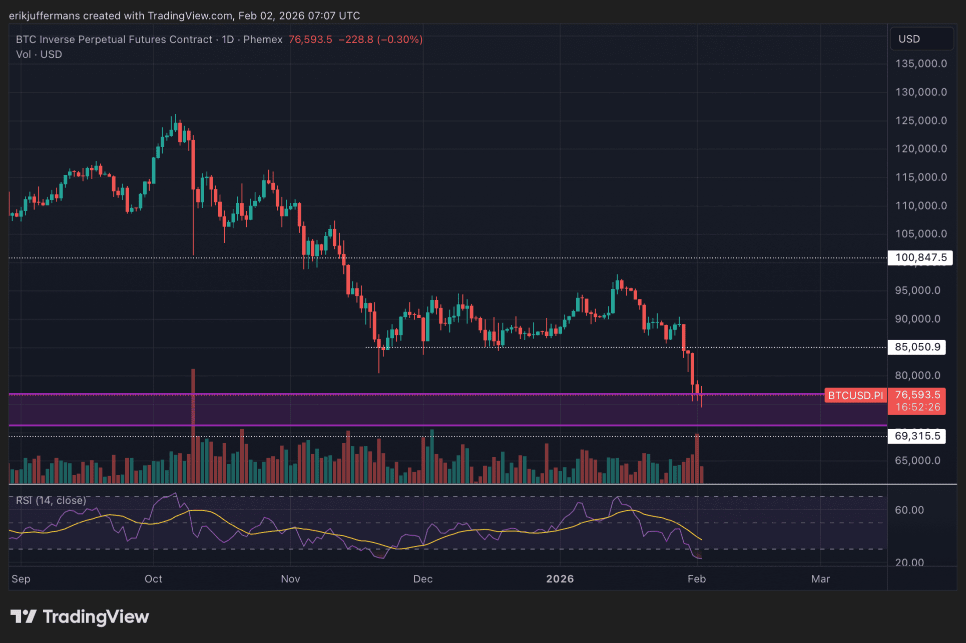 In een bullish scenario weet BTC stand te houden binnen de huidige steunzone. Een herstelrally kan de koers dan terugbrengen richting 85.000 dollar, een niveau dat de afgelopen maanden vaker als steun diende. In een bearish scenario breekt de zone alsnog. Dan komen 72.000 dollar en zelfs 69.000 dollar in beeld als volgende mogelijke steunpunten.