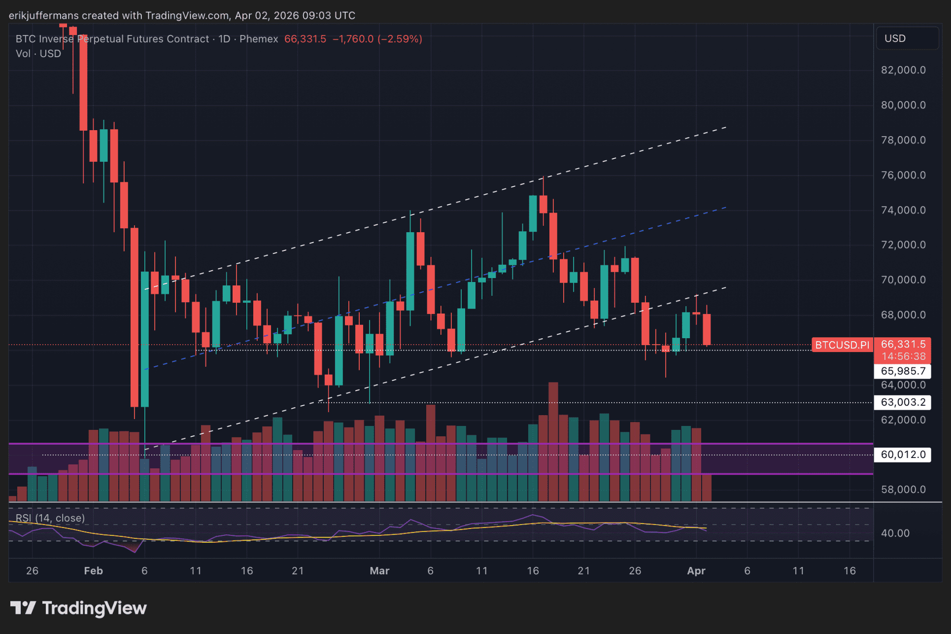 Onder 66.000 dollar is namelijk niet heel veel steun te bekennen. De zone rond 60.000 dollar zou bij een breakdown weer snel in beeld kunnen komen.