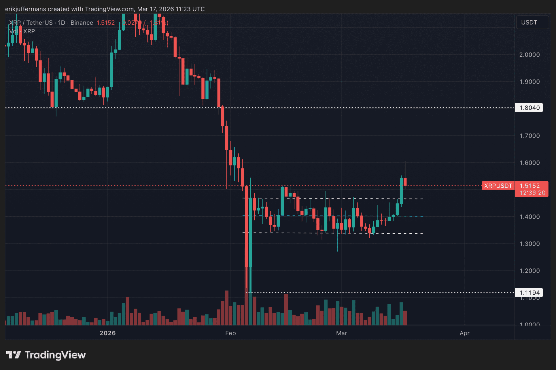 In onze vorige XRP-analyse noemden we twee niveaus om in de gaten te houden: 1,30 en 1,45 dollar. Een doorbraak van een van deze twee niveaus zou een indicatie zijn van de volgende richting. Deze twee niveaus vormden namelijk boven- en ondergrens van de zone waar XRP de afgelopen maanden in handelde.