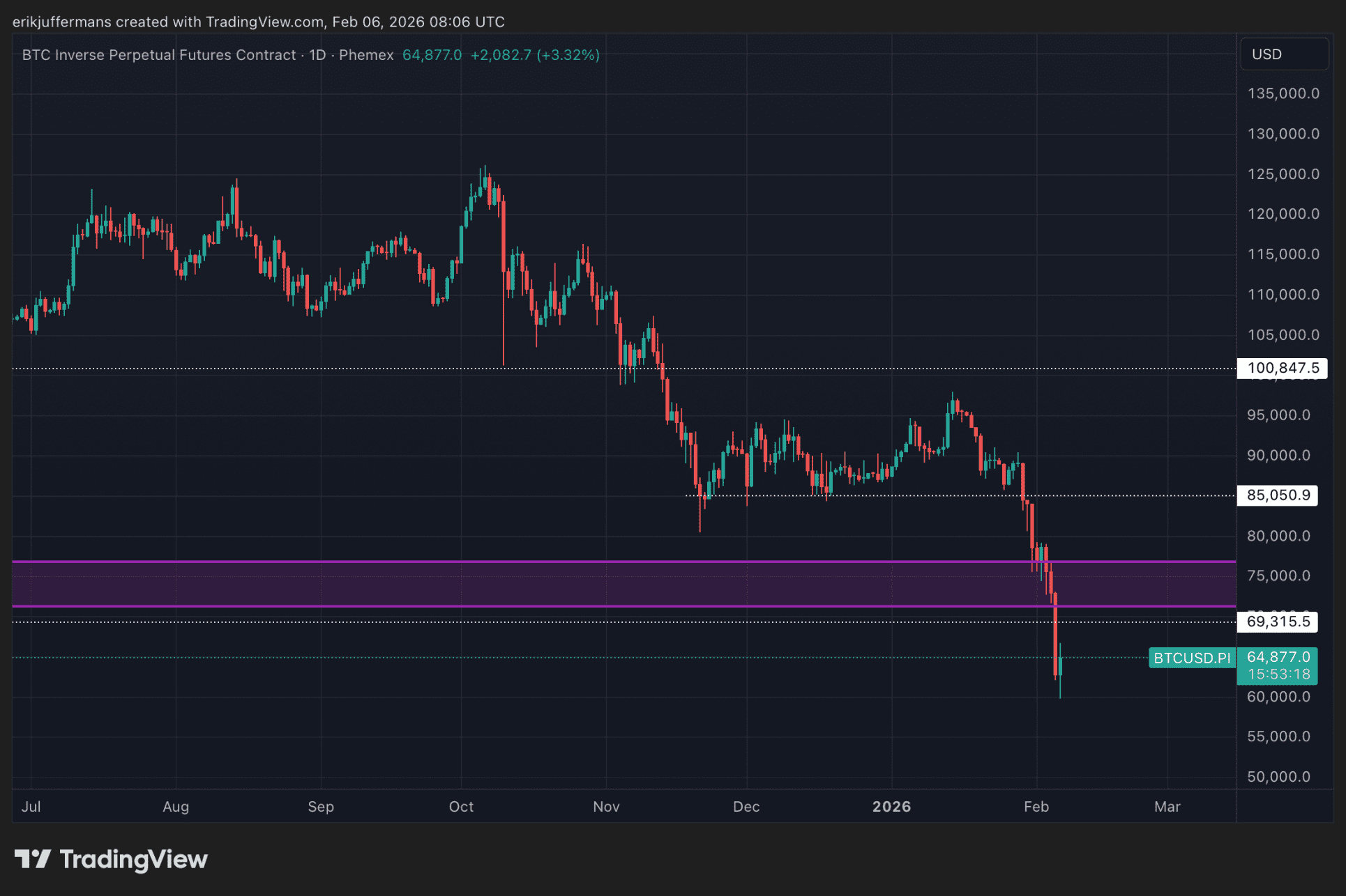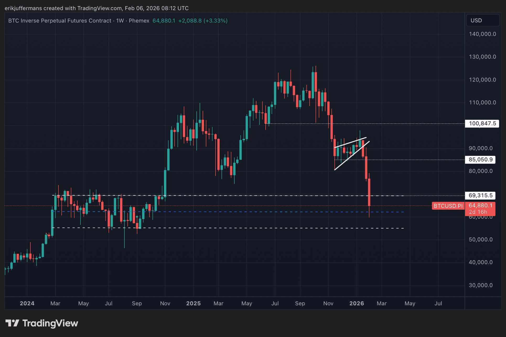 Technisch gezien lijkt de consolidatie van de afgelopen maanden achteraf een klassieke bearish formatie te zijn geweest. Juffermans wijst erop dat het bijbehorende technische koersdoel rond 55.000 dollar ligt. Dat maakt een extra neerwaartse beweging op korte termijn realistisch.