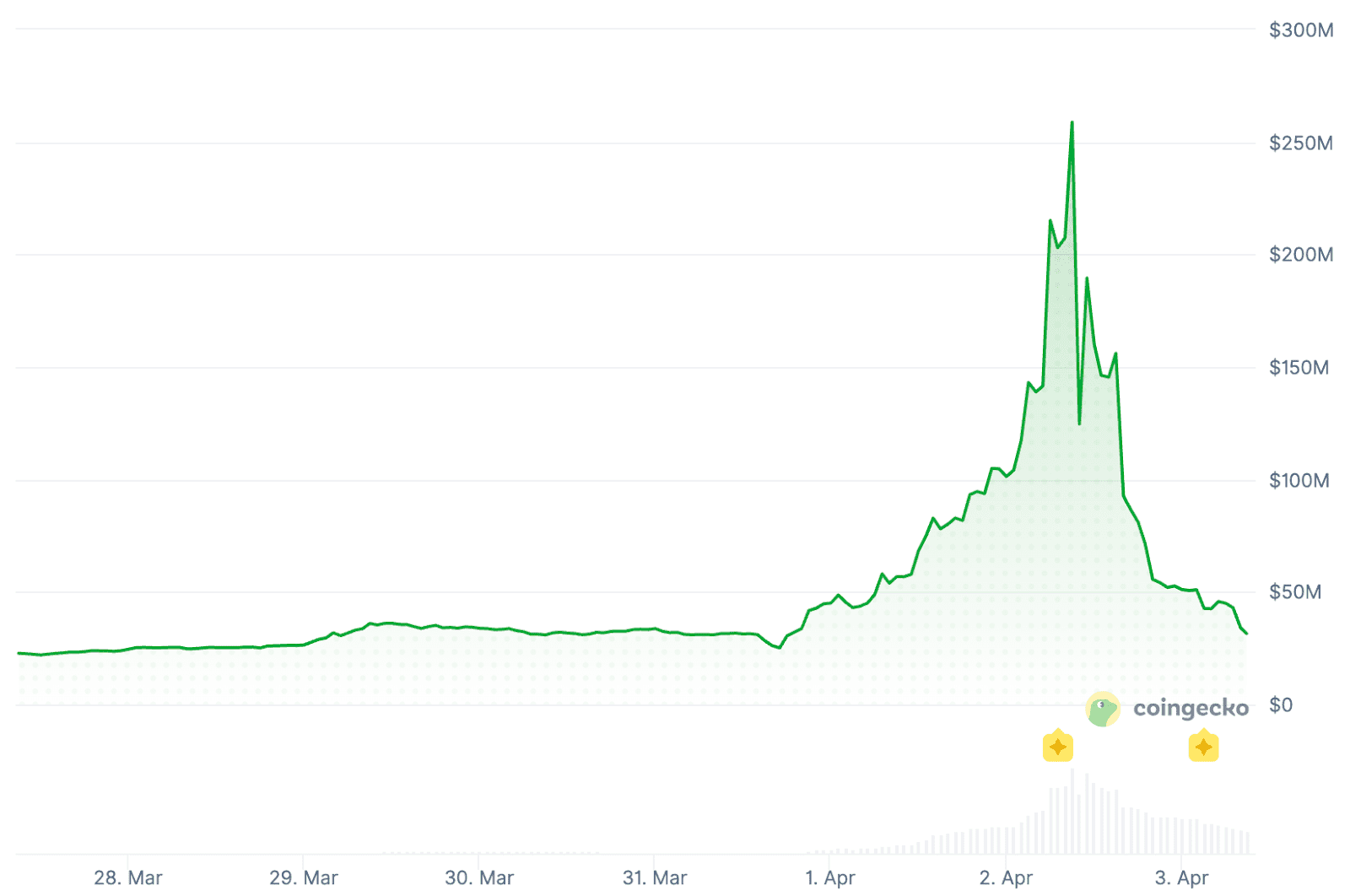 De koers steeg vanaf 31 maart met ongeveer 1.400 procent richting een all-time high van 1,72 dollar. Kort daarna volgde een scherpe daling. Op het moment van schrijven ligt de prijs rond de 0,13 dollar. Dat betekent een daling van 92 procent in korte tijd.