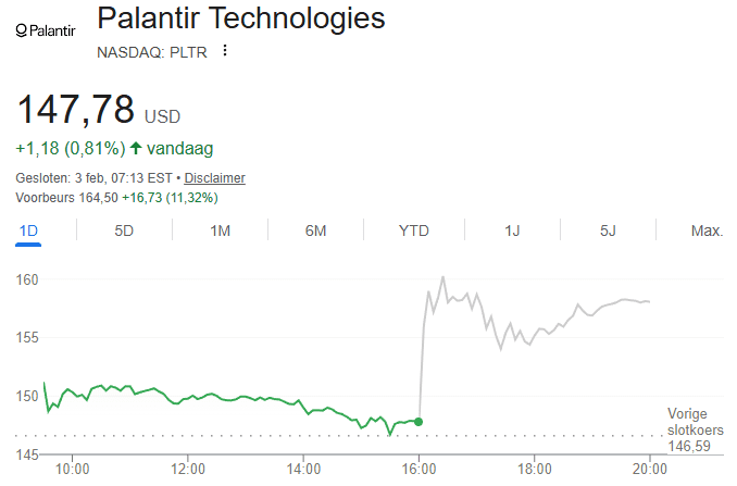 Het Palantir-aandeel sloot maandag op 147,77 dollar, maar stond dit jaar tot dan toe op een verlies van zeventien procent. Sinds de piek in november is het aandeel zelfs met 29 procent gedaald. De forse koerssprong nabeurs biedt dus een welkome adempauze.
