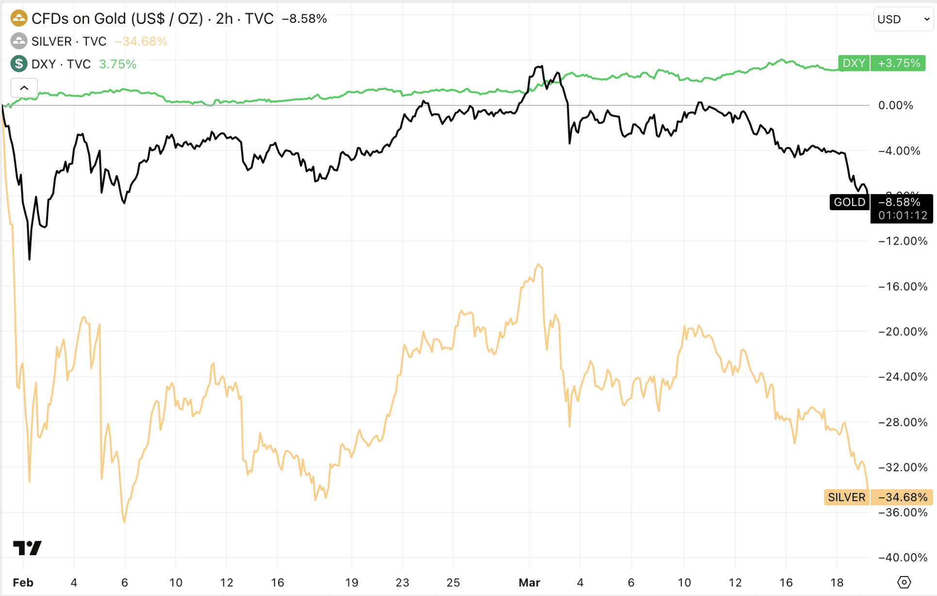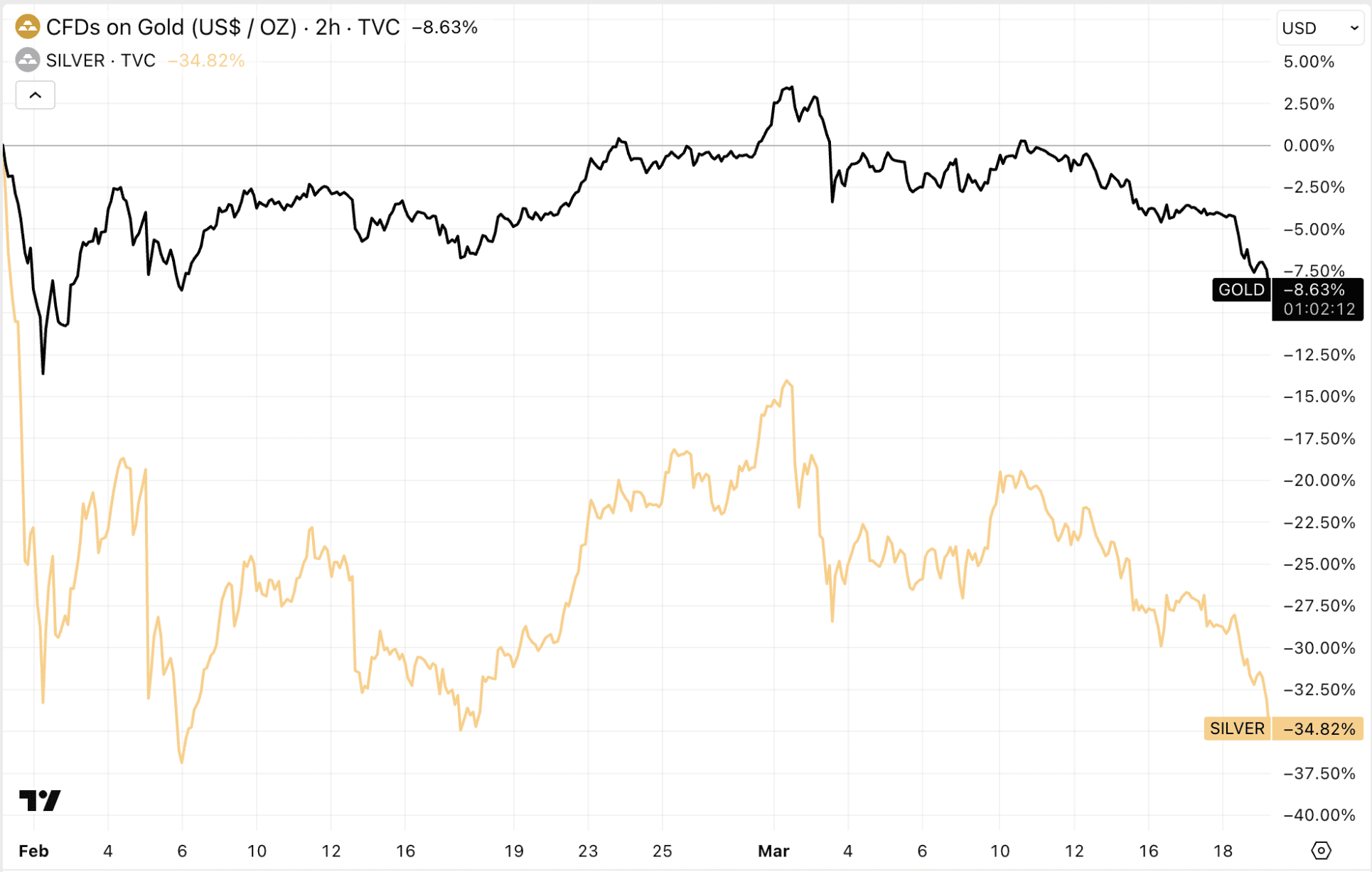 Deze tegenstelling tussen particuliere kooplust en institutionele winstnemingen zorgde voor grotere schommelingen in de markt. Inmiddels staat goud ongeveer 9 procent onder de piek van eind januari, terwijl zilver nog veel harder is teruggevallen.