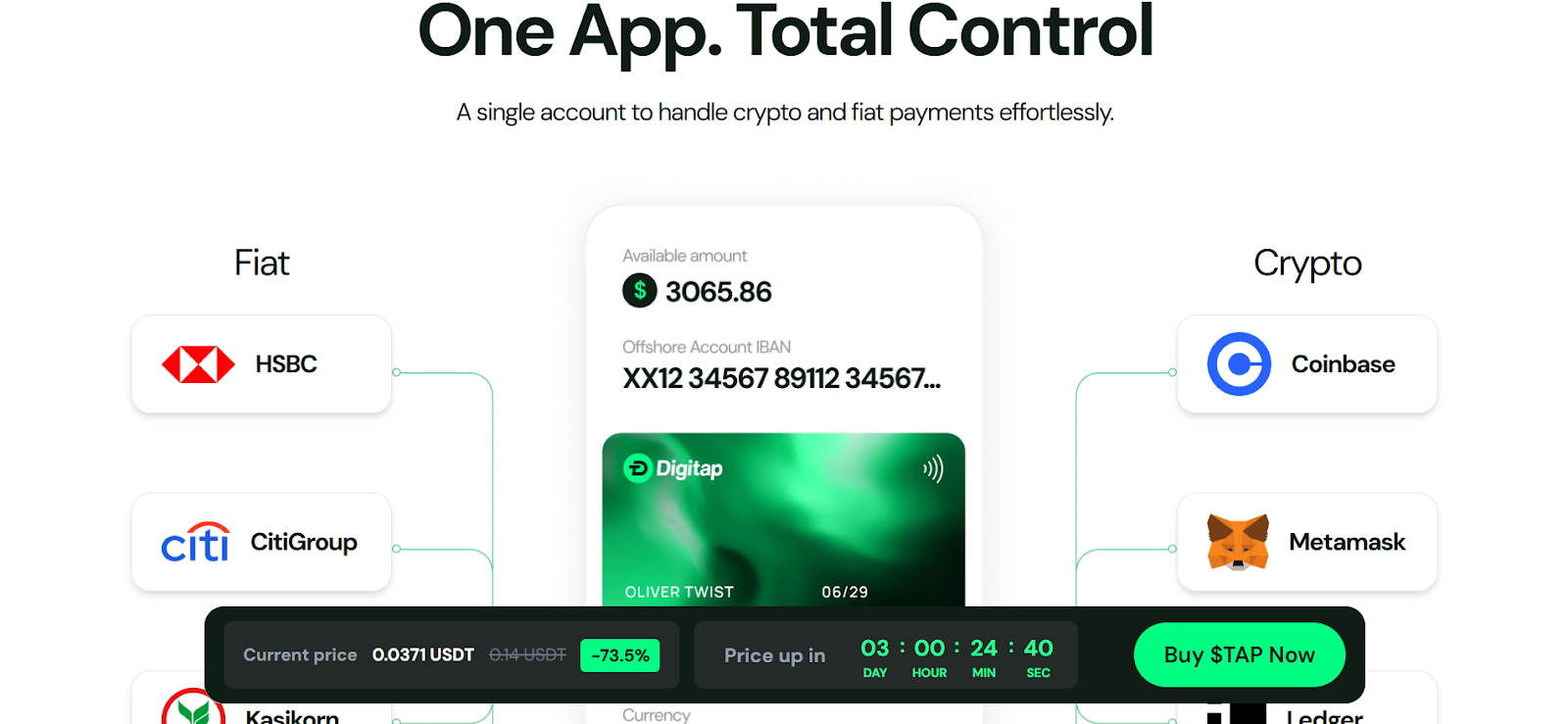 Digitap is een opkomend Web3-project dat betalingen wil vereenvoudigen door crypto- en fiatvaluta te integreren. Dit project realiseert dat via een moderne omnibank, waarmee gebruikers via een intuïtief dashboard hun crypto- en fiatgeld kunnen beheren, laten groeien en uitgeven.